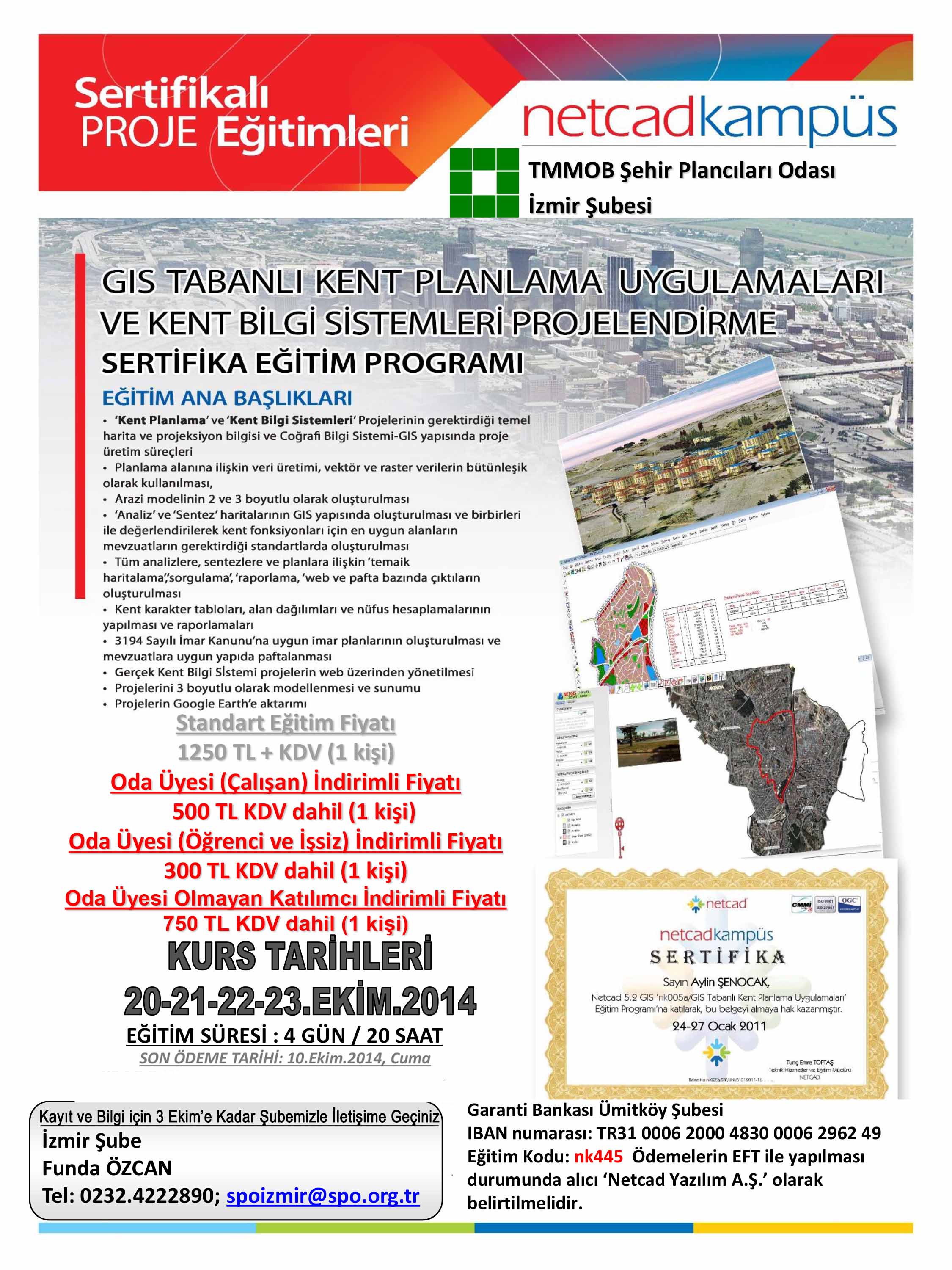 TMMOB Şehir Plancıları Odası İzmir Şubesi ve NETCAD işbirliğinde 20-21-22-23 Ekim 2014 tarihlerinde düzenlenecek sertifikalı NETCADKAMPÜS eğitim programına katılmak isteyenlerin 3 Ekim 2014 tarihine kadar Şubemizle iletişime geçmeleri gerekmektedir.
