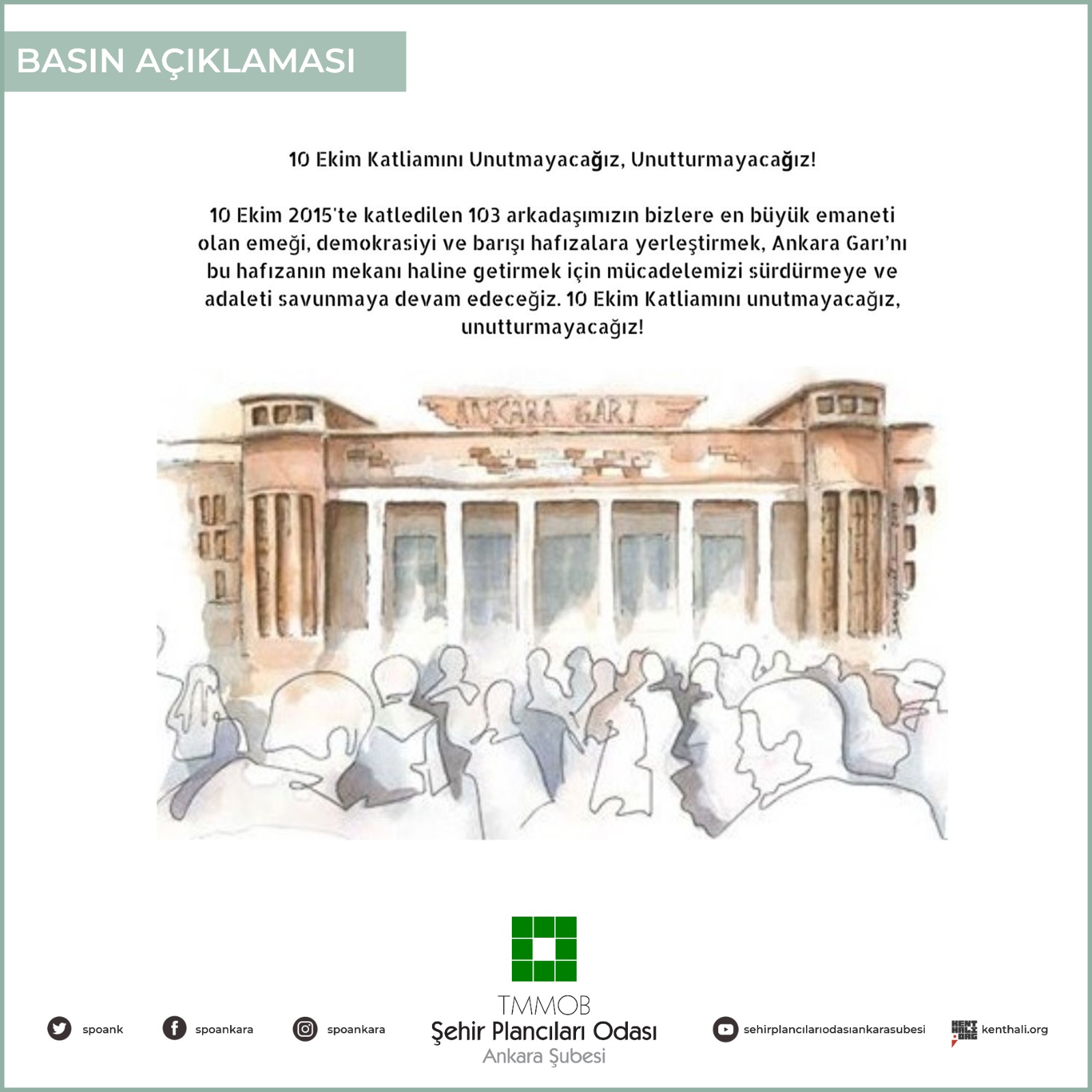 10 Ekim 2015te katledilen 103 arkadaşımızın bizlere en büyük emaneti olan emeği, demokrasiyi ve barışı hafızalara yerleştirmek, Ankara Garı`nı bu hafızanın mekanı haline getirmek için mücadelemizi sürdürmeye ve adaleti savunmaya devam edeceğiz.