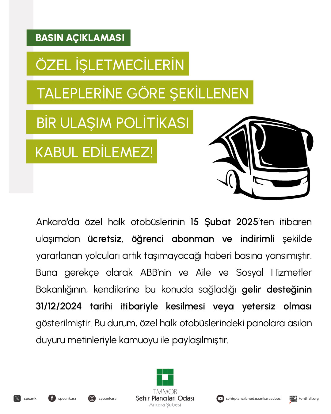 Ankara`da özel halk otobüslerinin 1 Şubat 2025`ten itibaren ulaşımdan ücretsiz, öğrenci abonman ve indirimli şekilde yararlanan yolcuları artık taşımayacağı haberi basına yansımıştır. Buna gerekçe olarak ABB`nin ve Aile ve Sosyal Hizmetler Bakanlığının, kendilerine bu konuda sağladığı gelir desteğinin 31/12/2024 tarihi itibariyle kesilmesi veya yetersiz olması gösterilmiştir. Bu durum, özel halk otobüslerindeki panolara asılan duyuru metinleriyle kamuoyu ile paylaşılmıştır.