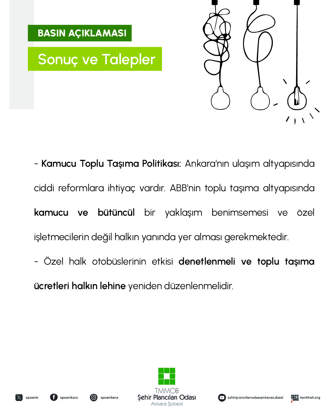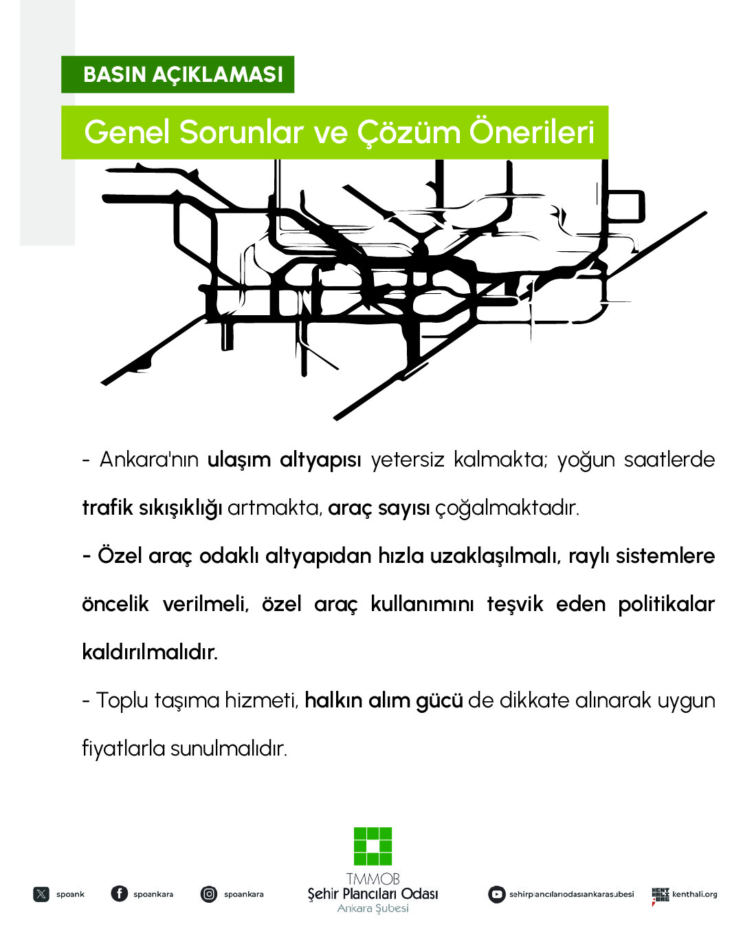 Elbette ki ana hatlarıyla değinilen bu başlıklar yalnızca bu döneme veya yakın tarihimize ait sorunlardan ibaret değildir. Geçmişten gelen kronik sorunlar, yerel ve merkezi yönetimlerin kentin ulaşım altyapısına yönelik kapsamlı ve bütünleşik bir planlama yaklaşımını gündeme almaması, kurumlar arasında eşgüdüm ve koordinasyon eksikliği, sermaye gruplarının taleplerine göre hizalanan kent yönetimleri gibi bir dizi sorun sıralanabilir. Ancak sorunlar kadar çözümler de bir o kadar bellidir ve ABB`nin üzerine düşen sorumluluğu yerine getirmediği yukarıda sıralandığı gibi apaçık ortadadır. Üstelik tüm bunlar yıllardır, hem Şubemiz tarafından ortaya konulmakta hem de kentsel ulaşım alanında çalışma yapan akademisyen ve uzman meslektaşlarımız tarafından dile getirilmektedir. Dolayısıyla yapılması gerekenler ortadadır.