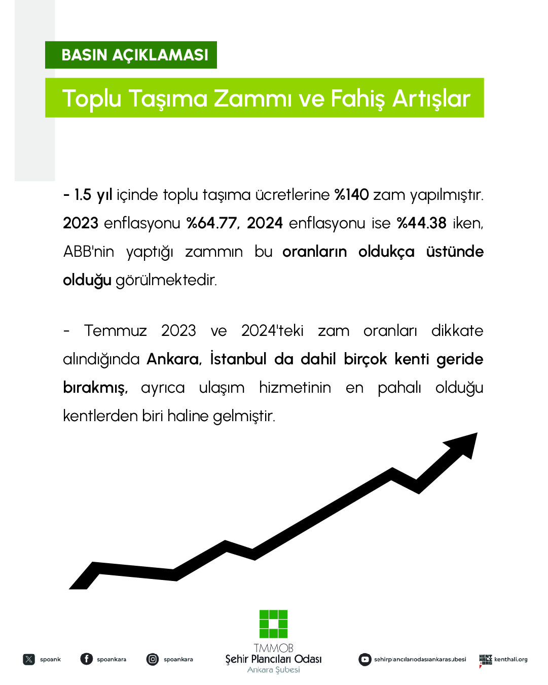 Yani 1.5 yıllık bir süre zarfında toplu taşımaya %140 oranında zam yapılmıştır. (Aynı dönem için bu oran İstanbul`da %73,71`dir.) Oysa ülkemizde 2023 yılı enflasyon oranı TÜFE değerleri üzerinden %64.77; 2024 yılı enflasyon oranı %44.38 olmak üzere toplamda yaklaşık %110 oranında gerçekleşmiştir. ABB tarafından yapılan zam oranının (%140) enflasyon değerinin çok üzerinde olduğu görülmektedir. ABB, bugüne kadar, toplu taşıma ücretlerine yapacağı zam öncesinde metro istasyonları ve EGO otobüslerindeki panolara artan maliyetleri gerekçe göstererek yapılan zammın ne kadar zorunlu olduğunu anlatan duyuru metinleri asmakta ve kendisini, gerçekleştireceği zamma direnen bir aktör olarak konumlandırmaya çalışmaktadır. Ancak rakamların açıkça gösterdiği şekilde böyle olmadığı gibi, ülke genelinde artan maliyetlerin faturasının ilk olarak halktan çıkarıldığını gözler önüne sermektedir.