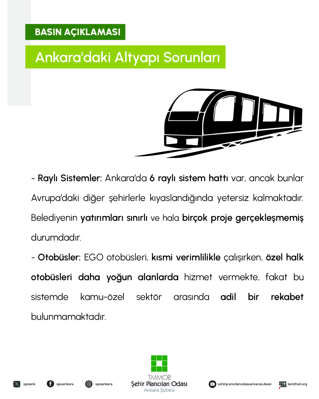 Şehir Plancıları Odası Ankara Şubesi olarak ABB`yi toplu taşıma altyapısında kamucu ve bütüncül bir eylem programını acilen devreye sokması konusunda uyarıyor, konunun takipçisi olacağımızı kamuoyuyla paylaşıyoruz.