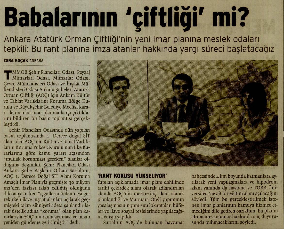 Ankara Büyükşehir Belediyesi ve Koruma Kurulunun el biriliğiyle onaylamış olduğu "Atatürk Orman Çiftliği 1. Derece Doğal Sit Alanı Koruma Amaçlı İmar Planı" adını taşıyan bu planda geçmişte 30 Milyon m2 den daha fazlası talan edilmiş olan AOÇ alanın üstündeki işgallerin önlenmesi ve tasfiyesi beklenirken, ilave inşaat alanları açılarak geçmişteki talan zihniyeti adeta şahlandırılarak üstelik adı "KORUMA " olan plan kararlarıyla AOÇnin ranta açılması ve talanı yeniden gündeme getirilmiştir.