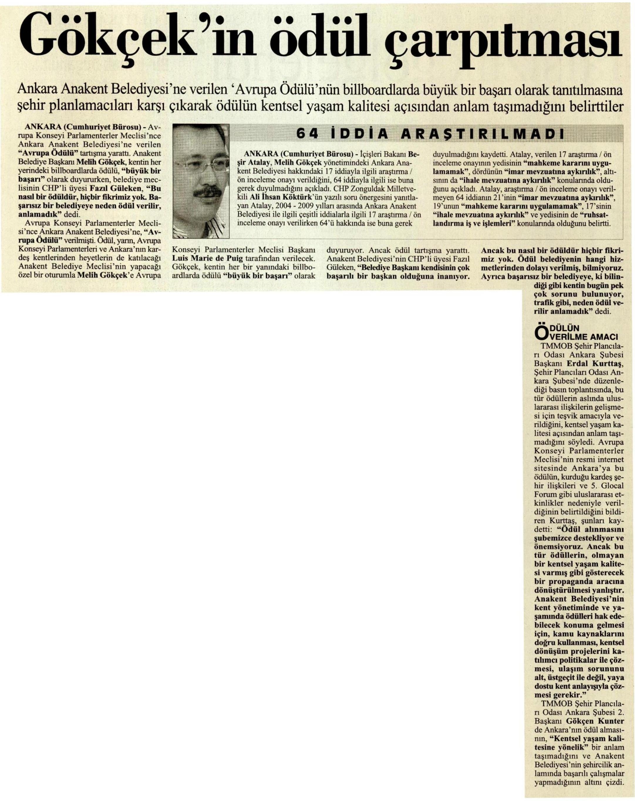 Ankara Büyükşehir Belediyesi yaptığı yazılı açıklama, internet sayfasından ve kentin çeşitli yerlerine astığı ilanlar ile kamuoyuna duyurduğu açıklamalarında Avrupa Ödülünü 10 Ekimde Dikmen Vadisi 3. Etap açılış töreni sırasında alacağını duyurmaktadır. Ankaranın Avrupa Konseyi Parlamenterler Meclisinin Avrupanın en iyi kentlerine verdiğini belirttiği Avrupa Ödülünü almaya hak kazandığı şeklinde kamuoyuna yansıyan açıklamalarında ve ödülün bir kentsel projenin açılışında verilerek, bu ödülün başarılı kent yönetimi ve uygulamalarına verildiği izlenimiyle kamuoyu yanlış yönlendirilmektedir. Sözkonusu ödül, asla kent yönetimi ve kentsel yaşam kalitesinin yükseldiğinin bir göstergesi değildir. Ayrıca bu ödül Avrupanın önde gelen kentlerine değil, çoğunlukla öne çıkması teşvik edilmek istenen, özellikle de son zamanlarda da eski doğu bloğu ülkelerine Avrupa ile bütünleşmelerini sağlamak üzere teşvik amacıyla verilmektedir. İstanbul 1959da, Bursa 1991de Avrupa Ödülünü almış kentlerimizdir. Teknik ve bilimsel ilkelerden uzak kent yönetim anlayışı, kamu yararı ve uluslararası düzeyde kabul görmüş şehircilik ilkelerine aykırı uygulamaları, ulaşımdaki fahiş ücretleri, barınma hakkı ellerinden alınan kentlileri, öneri ve uyarıları dikkate alınmayan sivil toplum ve meslek örgütleri, yıkımla tehdit edilen dünya çapındaki üniversiteleri, giderek yok olan kent kimliği ve doğal varlıkları ile; alınan ödülün Avrupa Konseyi Parlamenter Meclisinin sanki Ankara Büyükşehir Belediyesinin kentleşmedeki ve kent yönetimindeki başarısını takdir ettiği şeklinde gösterilmesi kamuoyunu yanıltmaktadır. Ankara Büyükşehir Belediyesi tarafından yapılan açıklamaya göre Ankara Büyükşehir Belediyesi Avrupa Konseyi Parlamenterler Meclisi tarafından "Avrupa Ödülü" almaya hak kazanmıştır. Ankara Kentinin tümünde ilan panoları ile 10 Ekim 2009 tarihinde bu ödülün Avrupa Konseyi Parlamenterler Meclisi Başkanı tarafından verileceği duyurulmaktadır. Ancak daha önce Avrupa Konseyi Parlamenterler Meclisi tarafından verilen "onur plakası" ve "onur bayrağı" ödüllerinde de olduğu gibi Ankara Kentini ve kamuoyunu yanıltıcı bir kampanya yürütülmeye başlanmıştır. Bu tür ödüller alındığında ödülün neden alındığı, ne amaçla verildiği gibi hususlar açıklanmamakta, ödül sanki kent yönetimindeki ve kentsel yaşam kalitesindeki artış için verildi izlenimi yaratılmaktadır.