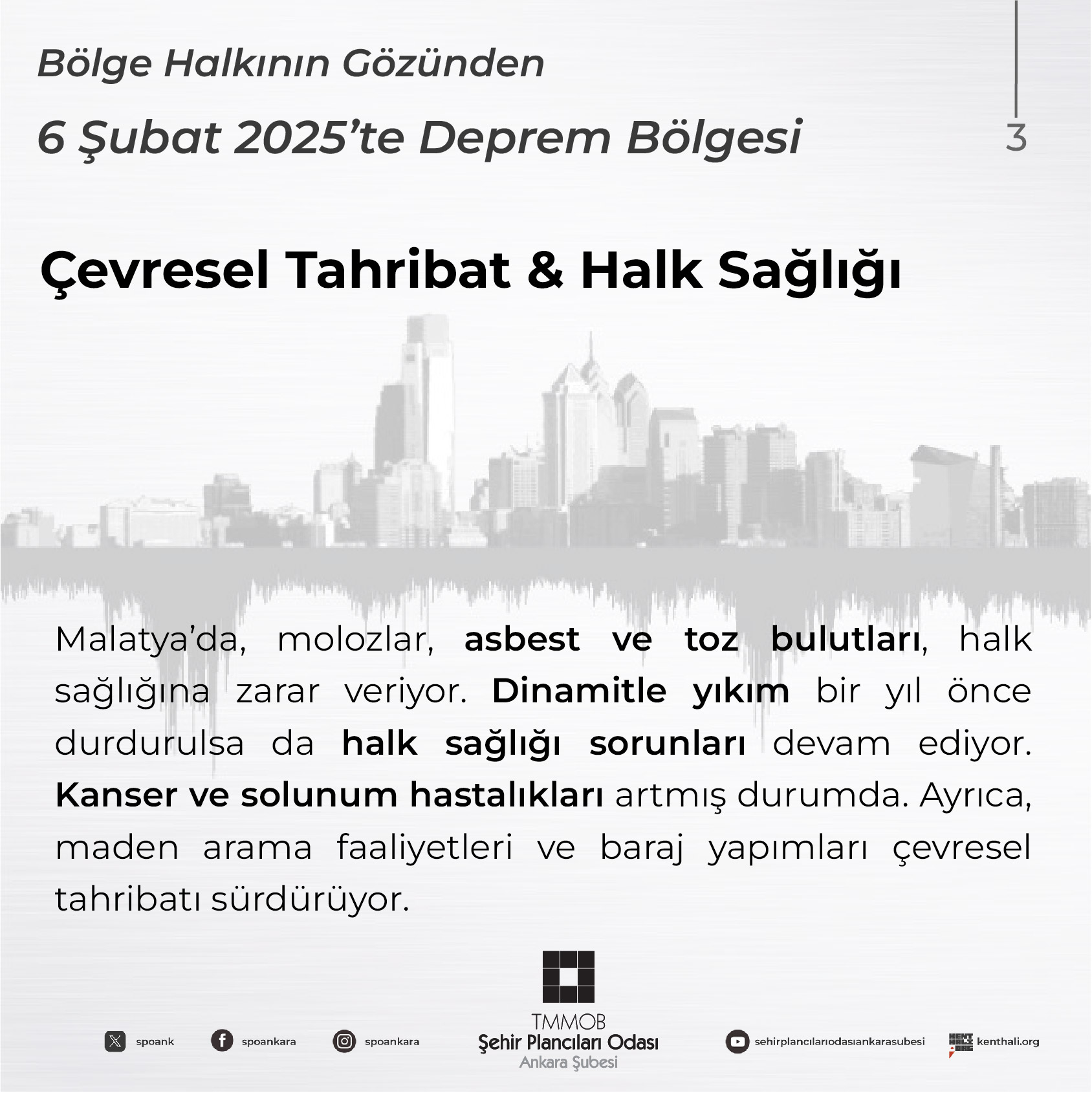 Depremlerin yarattığı yıkım, bölgede ciddi çevre sorunlarına da yol açtı. Ekolojik mücadelelerine depremden çok önce başlamış olan Malatya Çevre Platformu`ndan Hasan Kaya ve Yoldaş Ceylan ile yeniden görüştük. Hasan Kaya Şubat 2024`te Malatya`da yıkımının gerçekleştiği ilçelerdeki molozların (Battalgazi, Yeşilyurt, Akçadağ, Doğanşehir) ilin kuzeyindeki şehir mezarlığına yığıldığını ifade etmiş, rüzgar yönünün kuzey-güney olması sebebi ile asbestin tarım alanlarına ve yerleşim alanlarına savrulduğunu belirtmişti. Moloz kaldıran şirketlerin, atıkları akarsu yataklarına, kırsal yerleşimlerin yakınlarına ve tarım alanlarına döktüğünden bahsetmişti. Malatya`da depremden önce Beydağları`ndan gelen musluk suyunun içildiğinden, depremle zarar gören altyapı sebebi ile bu suyun kırmızı bir renk aldığını ve kullanılamaz durumda olduğunu ifade etmişti. Yine Malatya Çevre Platformu`ndan Yoldaş Ceylan ayrıca ağır hasarlı binaların yıkımının dinamitle patlatma yoluyla gerçekleştirildiğini, buna bağlı olarak ilde üst solunum yolları rahatsızlıkları, kalp rahatsızlıkları, kanser gibi halk sağlığı sorunlarında artış görüldüğüne dikkat çekmişti.