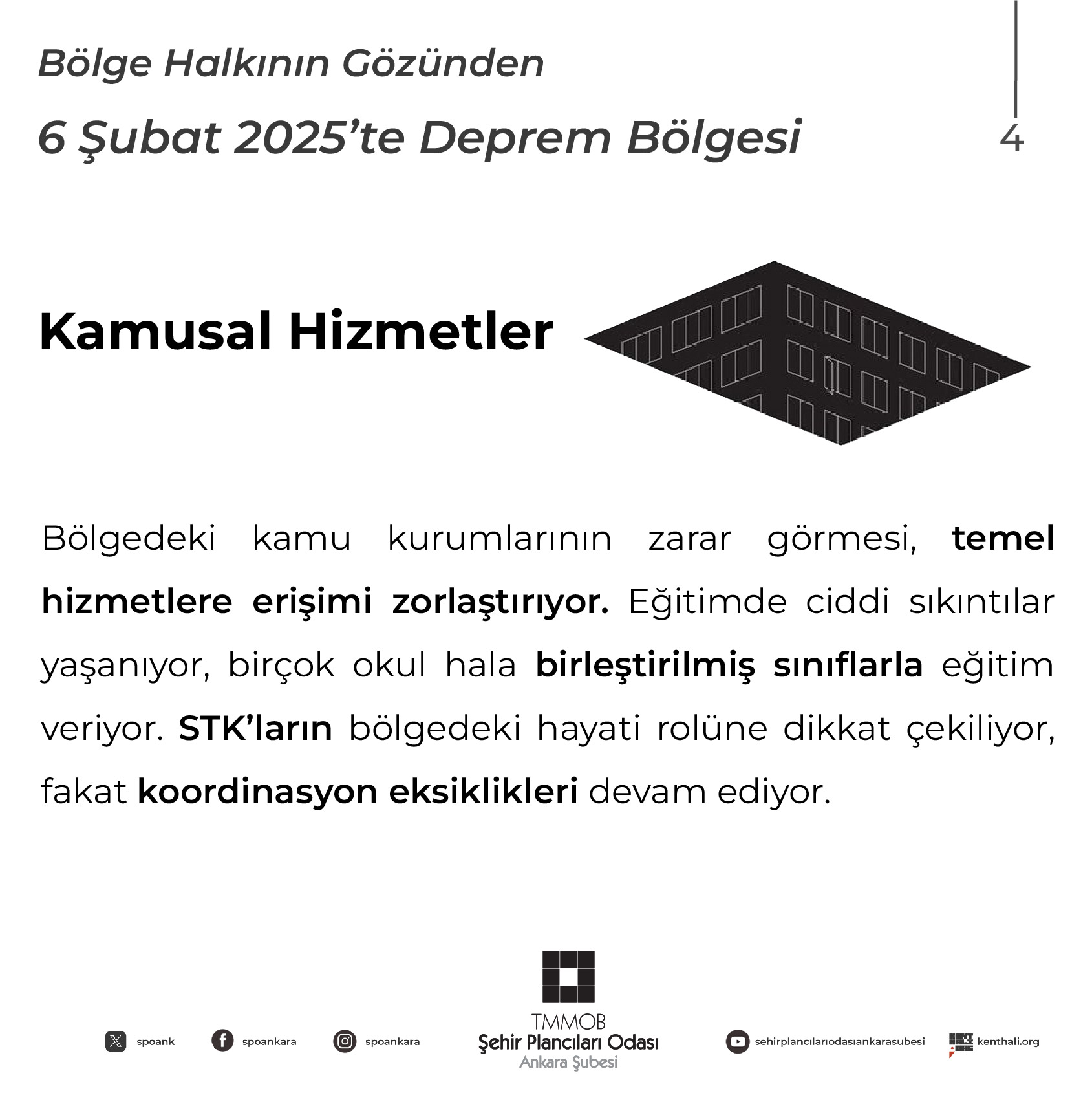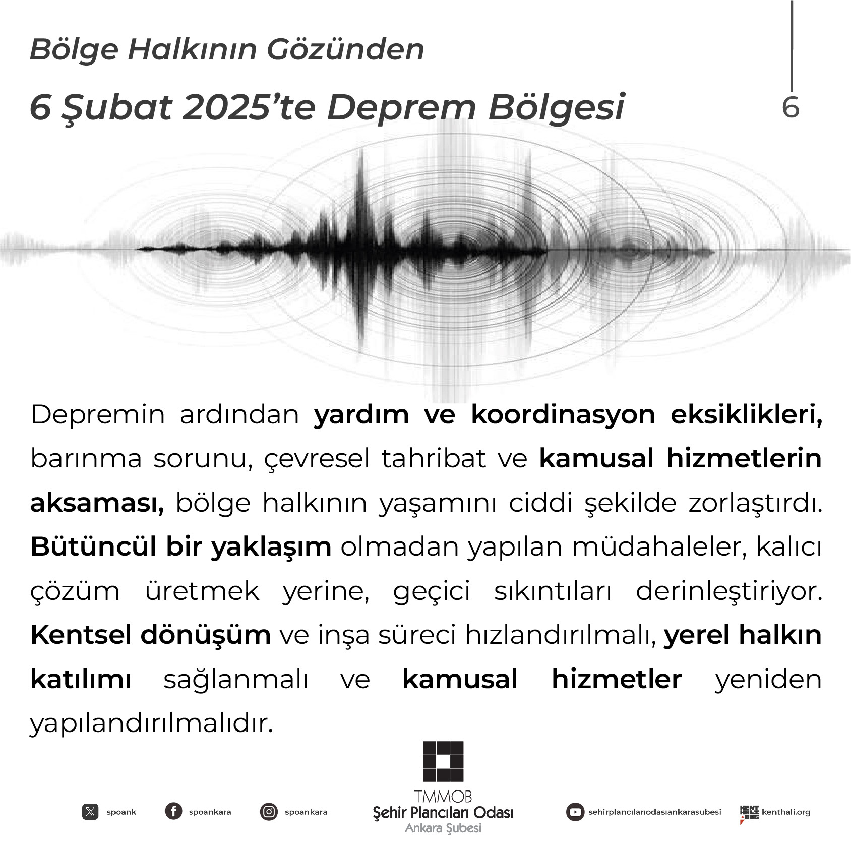 Bu yüzden, tüm yetkilileri daha fazla telafisi mümkün olmayacak yanlışa mahal vermeden; bir taraftan sağlıklı, güvenli geçici barınma alanlarını tamamlamaya, diğer taraftan planlı, programlı, katılımcı, kamu yararına uygun, şehircilik ilkeleri doğrultusunda şeffaf ve bütünlüklü bir yeniden inşa yaklaşımını hayata geçirmeye davet ediyoruz."