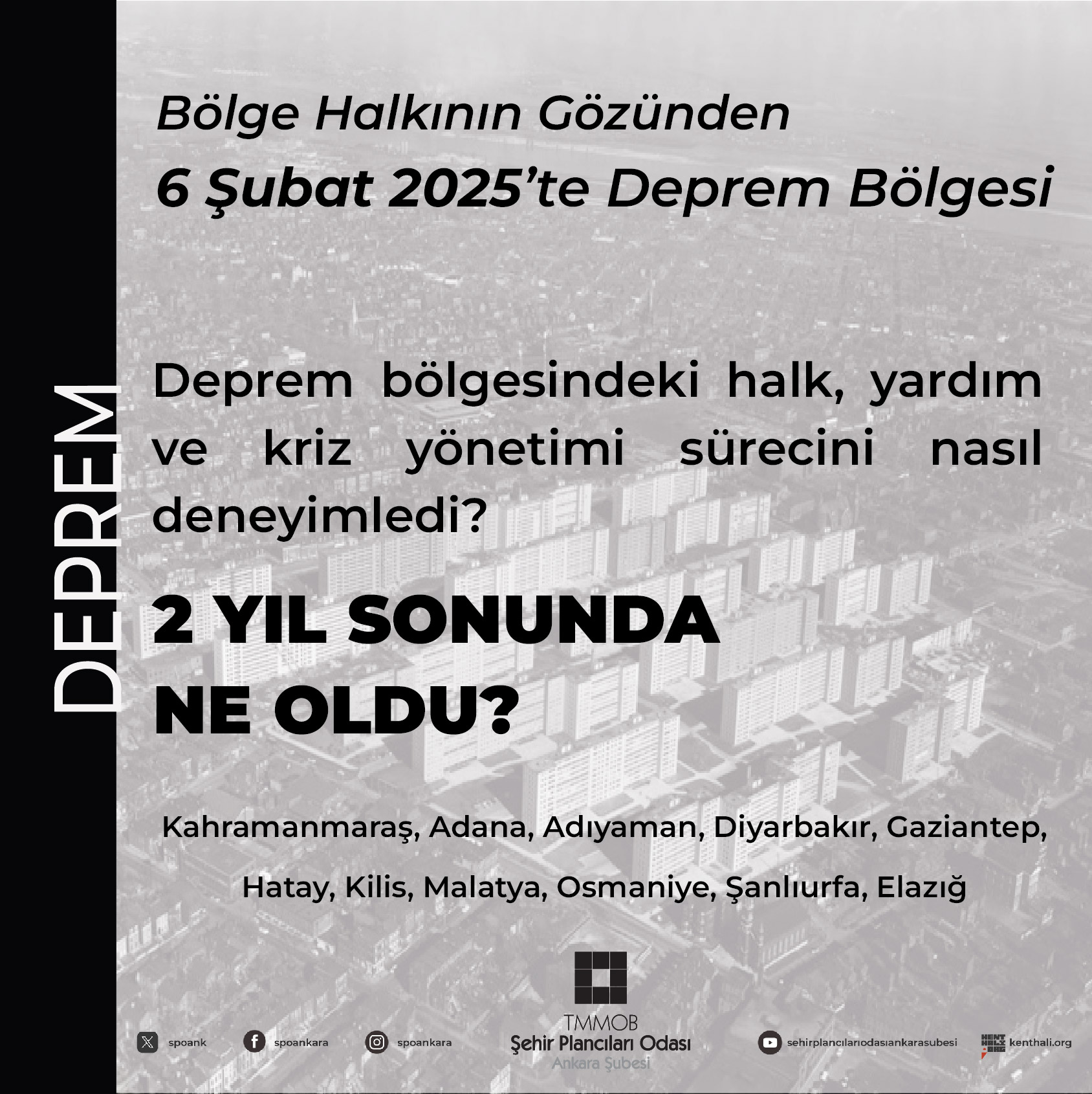 Depremin üzerinden iki yıl geçmesine rağmen merkezi ve yerel yönetimlerin bölgenin en temel ihtiyaçlarını dahi halen karşılamadığı, tüm çabalarımıza rağmen cumhurbaşkanı kararnamesi gibi araçlarla kentlerin yeniden inşası sürecinde planlama meslek alanının devre dışı bırakıldığı ve vatandaşların en acil ihtiyaçlarının dahi çözüm beklediği bir tabloyla karşı karşıyayız. Tam da bu noktada meslek alanımızı doğrudan ilgilendiren barınma krizi, çevresel tahribat, kentsel politikalar, yerel hizmetlerin sunumu, kültürel mirasın korunması gibi meselelerdeki son durumu ilk ağızdan öğrenmek için bir kez daha Deprem Konuşmaları panelistleri ile bir araya geldik.