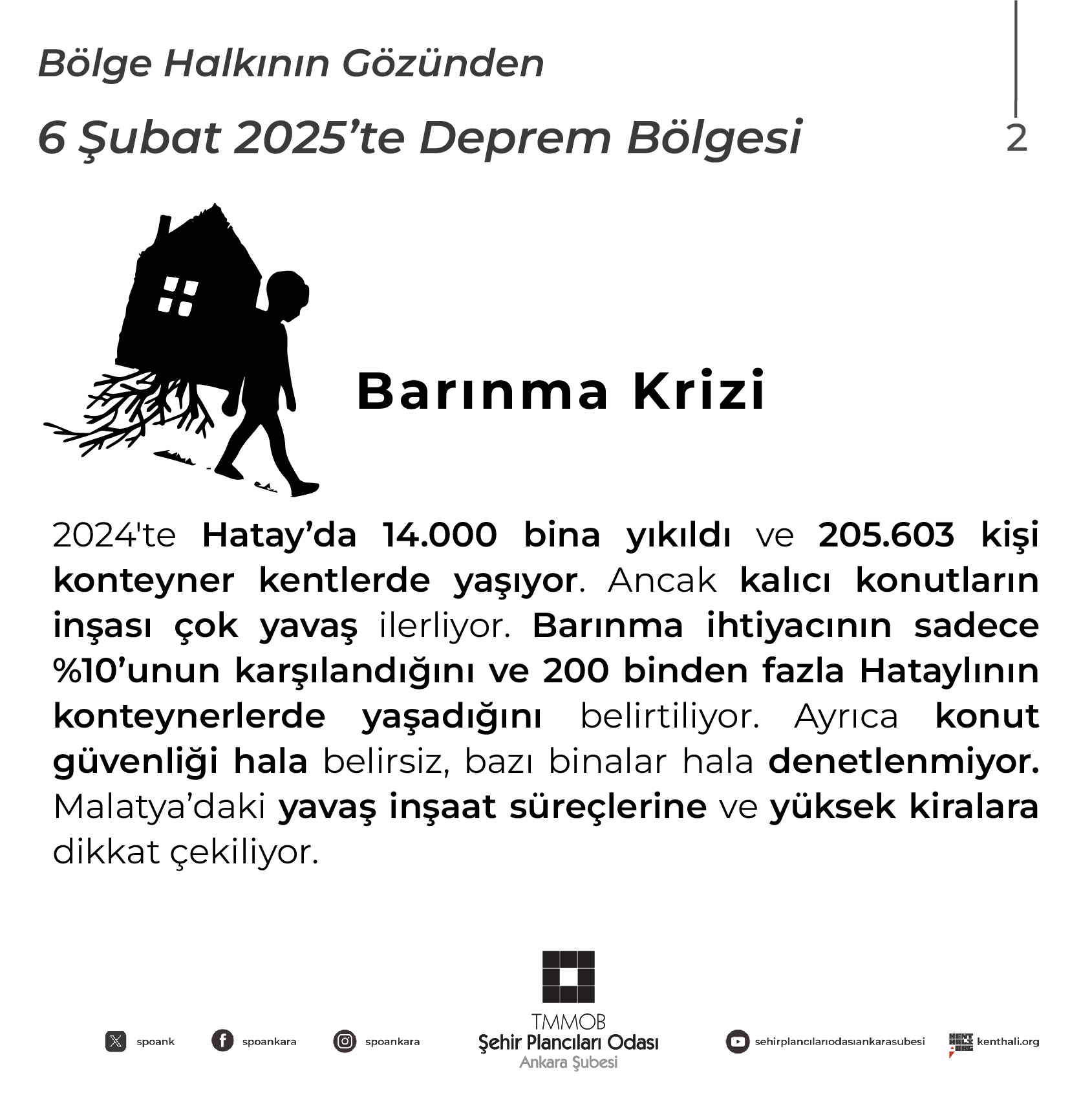 Hatay Deprem Dayanışma Derneği`nden Cansel Aslan depremin üzerinden iki yıl geçmesine rağmen bölgenin en temel sorunlarından birinin hâlâ çözülemeyen barınma krizi olduğunu dile getirdi. Deprem bölgesinde konut ihtiyacının ancak %10`unun karşılanabildiğini belirten Aslan, 200 binden fazla Hataylının hâlâ konteynerlerde yaşamak zorunda kaldığını ifade etti. Konteynerlerin nitelikli geçici barınma alanı olarak değerlendirilmesinin mümkün olmadığını, bu alanlarda yaşayan insanların eğitim, sağlık, ulaşım vb. en temel ihtiyaçlarının dahi giderilmediğini vurgulayarak, depremzedelerin bu "depremkondularda" kendi imkanları ile yaşam mücadelesi sürdürdüğünü belirtti.