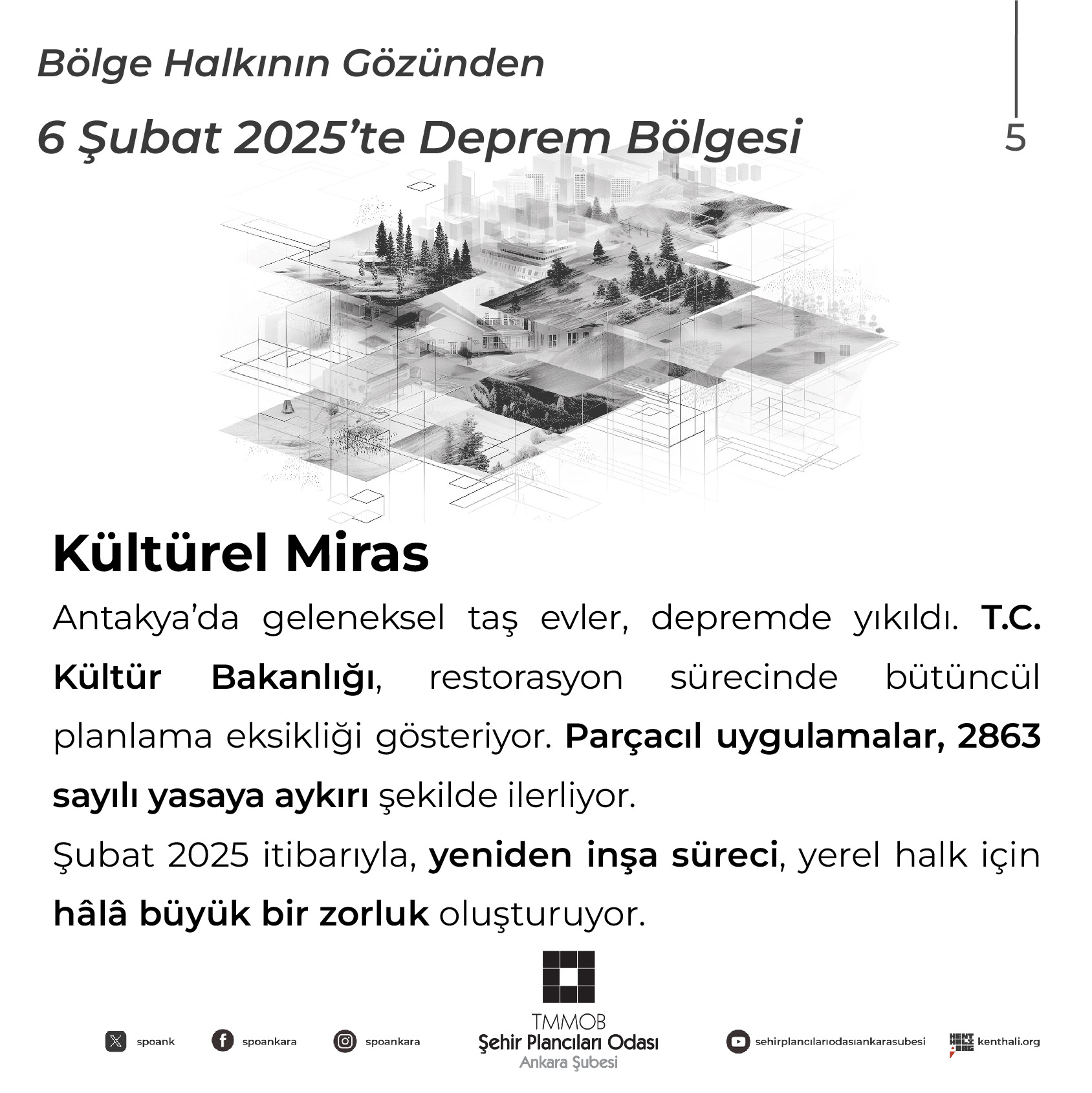 Özetle Antakya`da yer alan kültürel miras alanında koruma ve planlama pratikleri, Dr. Çobanyılmaz`ın ifade ettiği üzere parçacıl uygulamalarla, planlama disiplini bypass edilerek uygulanıyor. Ne yazık ki bu durum, Doç. Dr. Suvar Aslan`ın Şubat 2024`te dile getirdiği endişeler konusunda haklı çıktığını gözler önüne seriyor: Bölgede planlama bütüncül planlama anlayışına ve 2863 sayılı Kültür ve Tabiat Varlıklarını Koruma Kanunu`nun ruhuna tamamen aykırı bir şekilde ilerliyor. Ayrıca Doç. Dr. Suvar Aslan`ın belirttiği üzere depremden önce dahi kafe, restoran gibi ticari işletmelere dönüşmeye başlayan tarihi kent merkezindeki konut alanlarında yıkımın giderilip giderilmediği ve bir tür soylulaştırma mekanizmasının devreye sokulup sokulmadığı ile ilgili şüpheler geçerliliğini koruyor. Şubat 2024`te rezerv alan ilan edilmesinden sonra tarihi kent merkezinin ablukaya alındığını ve kentlilere yapılacak çalışmalar ile ilgili herhangi bir bilgi verilmediğini söyleyen Cansel Aslan, Şubat 2025`te de benzer ifadeler kullandı. Tarihi mekanların bir kısmının T.C. Kültür ve Turizm Bakanlığı`nın isminin yazılı olduğu brandalarla kapatıldığını, kentlilerin brandanın diğer tarafında neler olduğunu öğrenmeye yönelik bekleyişinin devam ettiğini söyledi. Ek olarak restorasyon süreçlerinin şeffaf olmaması bir yana tarihi mekanlara ve sokaklara kepçelerle kontrolsüz müdahalelerin devam ettiğinin, depremin üzerinden iki yıl geçmesine rağmen kültürel miras niteliği taşıyan bu alanlarda yıkım ve enkaz kaldırma işlerinin bitmediğinin altını çizdi.