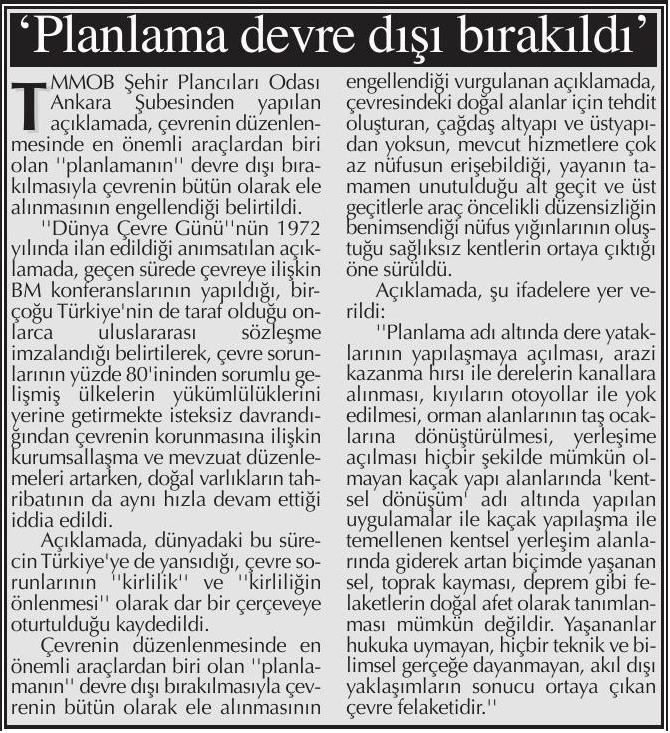 - Ankara Büyükşehir Belediye Meclisinin 11.09.2009 gün ve 2116 sayılı kararı ile onaylanan 1/5000 ölçekli Yenimahalle ilçesi Yuva Mahallesi Yerleşik ve Gelişme Alanı Nazım İmar Planı değişikliği ile açıkça hukuka, planlama ilkelerine, kamu yararına ve kamu güvenliğine aykırılık oluşturularak Ankarada "taşkın alanının daraltılması" yoluyla yapılaşma olanağı yaratılması aynı zamanda çevre felaketi için davetiye hazırlanması anlamını taşıdığı bilinmelidir.