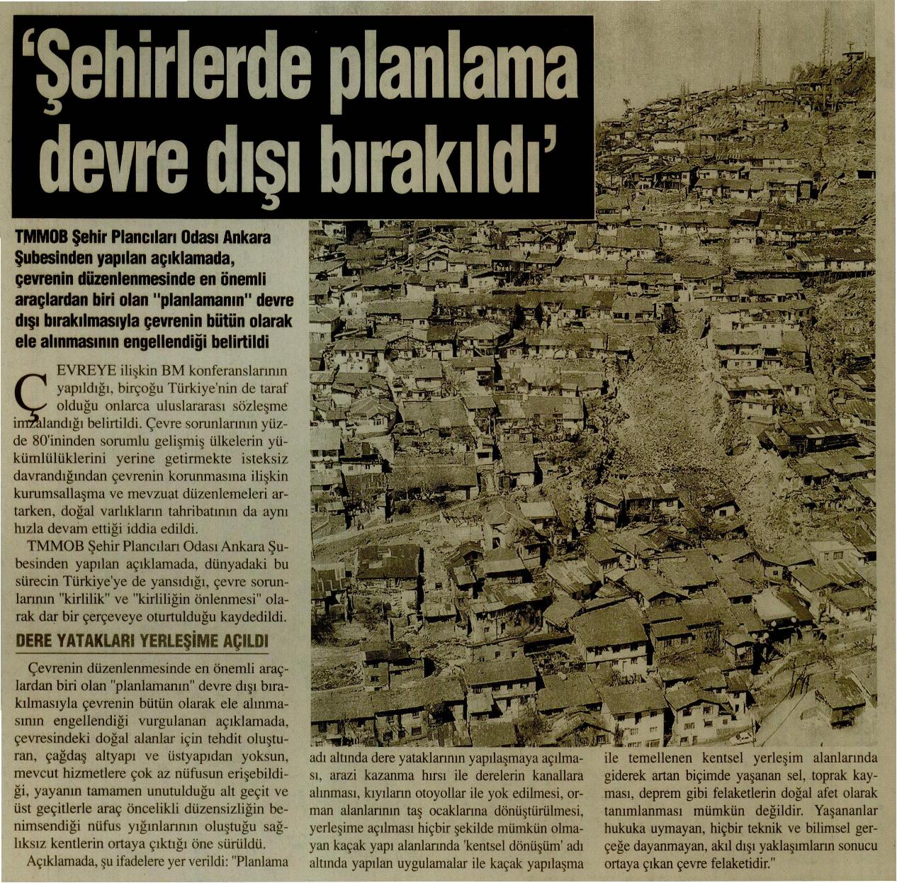 "Planlama" adı altına dere yataklarının yapılaşmaya açılması, arazi kazanma hırsı ile derelerin kanallara alınması, kıyıların otoyollar ile yok edilmesi, orman alanlarının taşocaklarına dönüştürülmesi, yerleşime açılması hiçbir şekilde mümkün olmayan kaçak yapı alanlarında "kentsel dönüşüm" adı altında yapılan uygulamalar ile kaçak yapılaşma ile temellenen kentsel yerleşim alanlarında giderek artan biçimde yaşanan sel, toprak kayması, deprem gibi felaketlerin "doğal afet" olarak tanımlanması mümkün değildir. Yaşananlar hukuka uymayan, hiçbir teknik ve bilimsel gerçeklere dayanmayan, akıldışı yaklaşımların sonucu ortaya çıkan "çevre felaketi"dir.