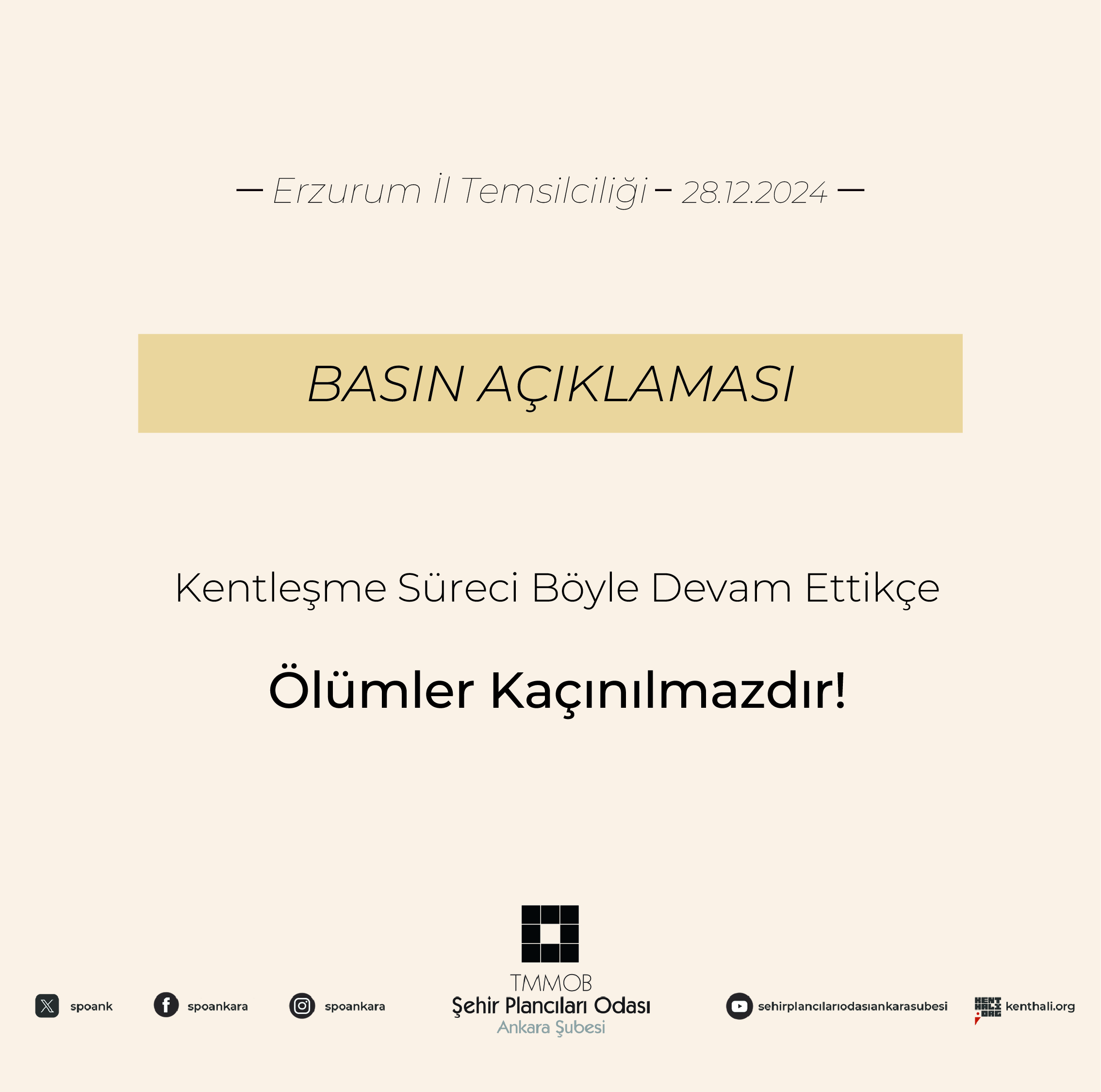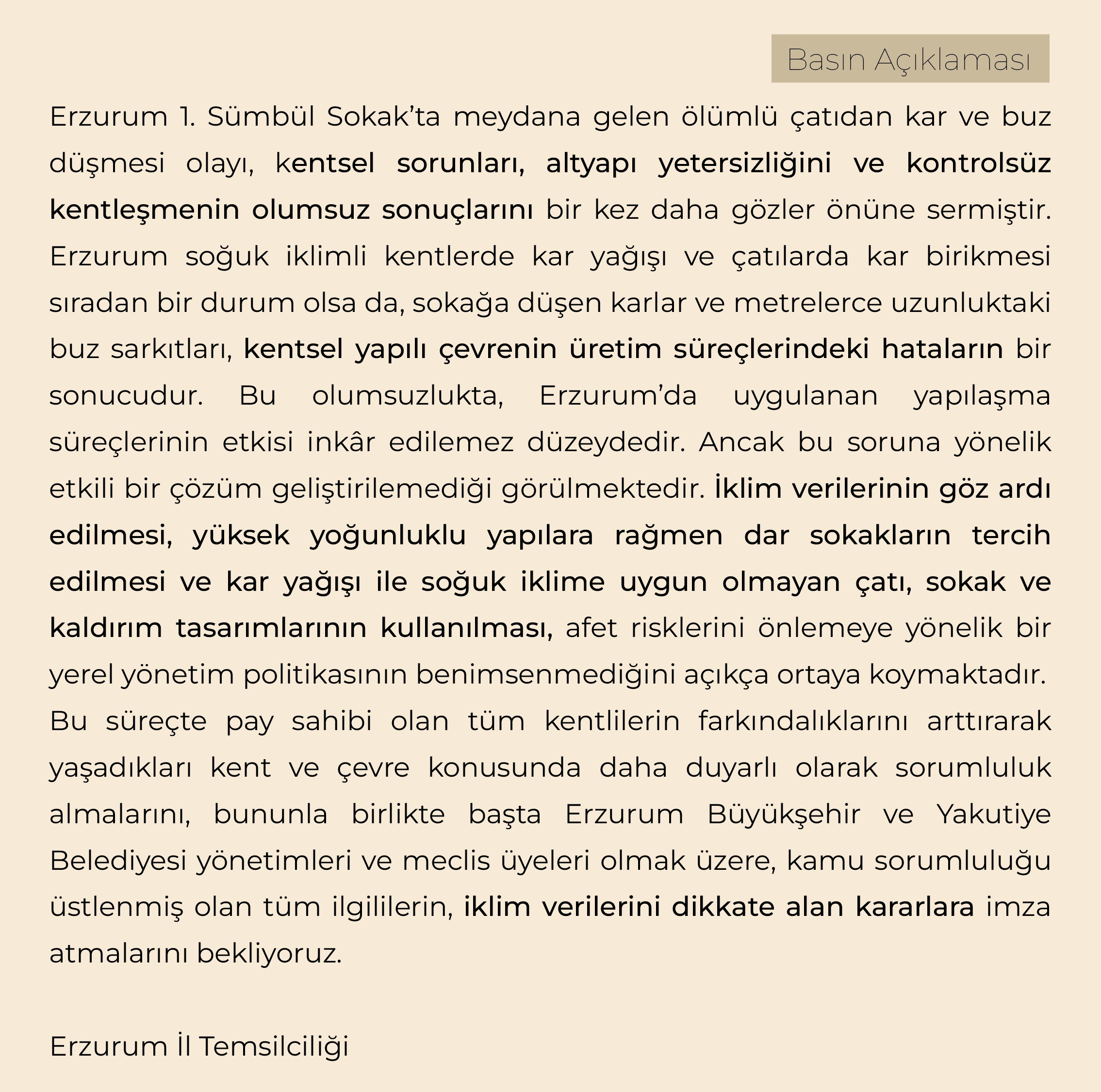 Erzurum`un yaşadığı kentsel gelişim sürecini yakından takip eden Şehir Plancıları olarak son dönemde yaşanan gelişmeleri üzüntüyle değerlendirmekteyiz. Gelecek adına kaygılarımızı artıran gelişmelerin yaşandığı kentimizde bir durum tespiti yapmak ve doğal değerlere yaklaşımımız ve sonuçları üzerinden tarihe bir not düşmek gerekliliğini hissetmekteyiz. Konumuz Erzurum`un Yakutiye ilçesi Lalapaşa Mahallesi 1.Sümbül sokakta 24 Aralık 2024 tarihinde akşam saatlerinde çatıdan düşen kar ve buzun altında kalan Atatürk Üniversitesi öğrencisinin ölümüyle sonuçlanan vahim olayla ilgilidir. Kentin merkezi iş alanındaki dar bir sokak üzerinde yaşanan olay ve ortaya çıkan görüntüler tüm Türkiye`nin dikkatini çekmiştir.