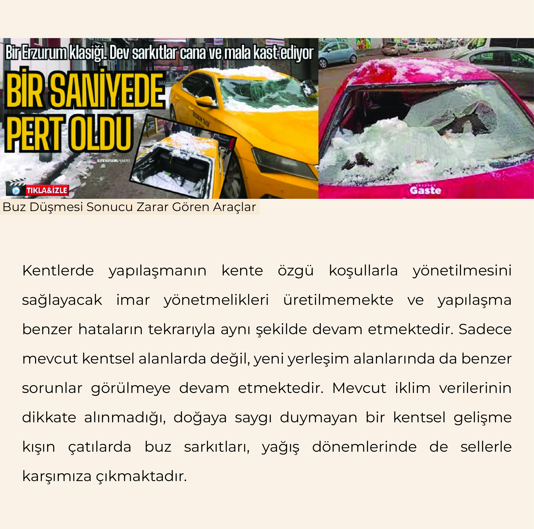 Erzurum 1. Sümbül Sokak`ta meydana gelen ölümlü çatıdan kar ve buz düşmesi olayı, kentsel sorunları, altyapı yetersizliğini ve kontrolsüz kentleşmenin olumsuz sonuçlarını bir kez daha gözler önüne sermiştir. Erzurum soğuk iklimli kentlerde kar yağışı ve çatılarda kar birikmesi sıradan bir durum olsa da, sokağa düşen karlar ve metrelerce uzunluktaki buz sarkıtları, kentsel yapılı çevrenin üretim süreçlerindeki hataların bir sonucudur. Bu olumsuzlukta, Erzurum`da uygulanan yapılaşma süreçlerinin etkisi inkâr edilemez düzeydedir. Ancak bu soruna yönelik etkili bir çözüm geliştirilemediği görülmektedir. İklim verilerinin göz ardı edilmesi, yüksek yoğunluklu yapılara rağmen dar sokakların tercih edilmesi ve kar yağışı ile soğuk iklime uygun olmayan çatı, sokak ve kaldırım tasarımlarının kullanılması, afet risklerini önlemeye yönelik bir yerel yönetim politikasının benimsenmediğini açıkça ortaya koymaktadır.