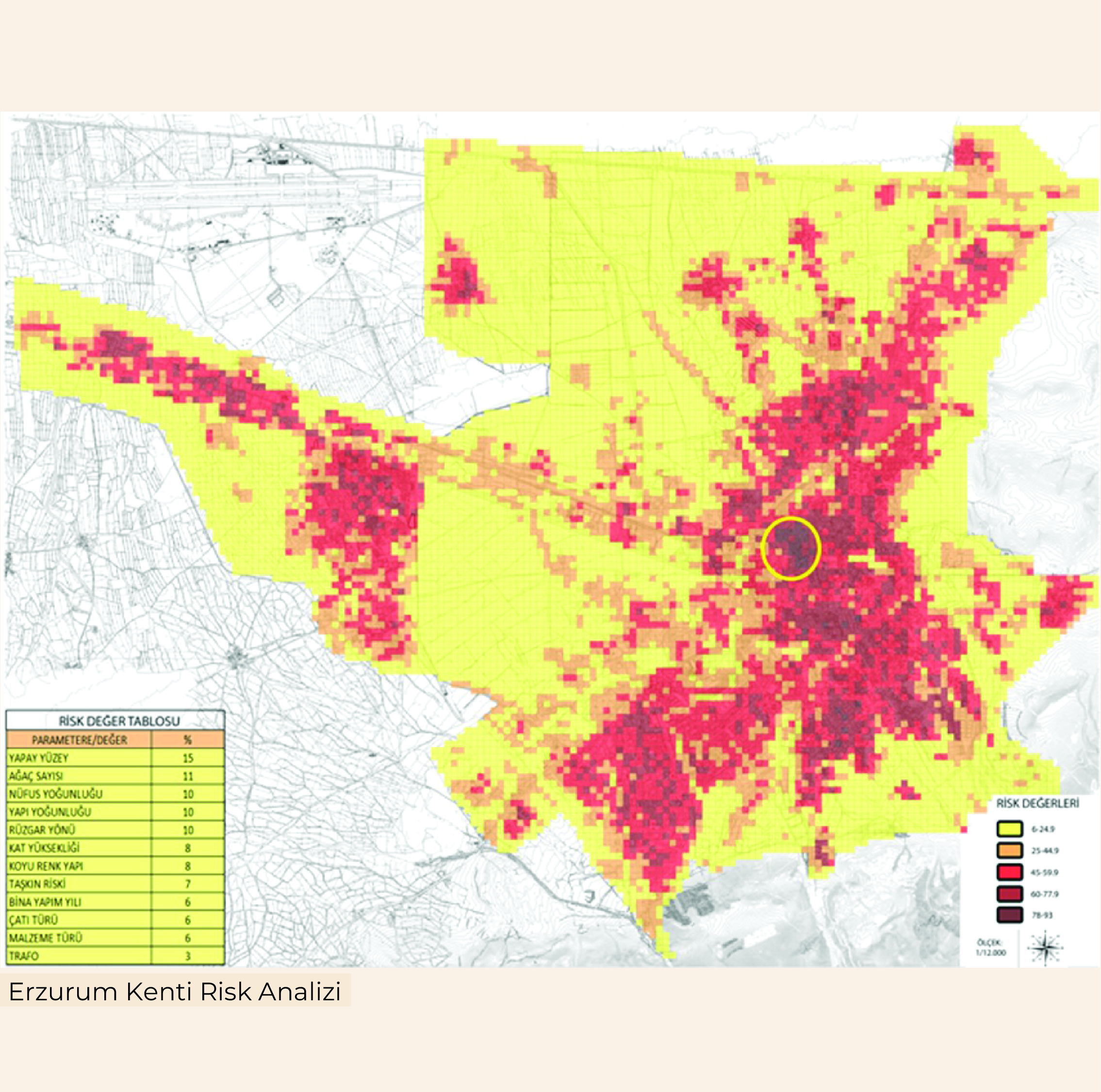 Bir diğer bilgi Erzurum kent merkezi için odamız üyeleri Prof.Dr.Doğan Dursun ve Dr.Öğr.Üyesi Merve Yavaş tarafından yapılan ve iklim riski değerlendirmesi içeren çalışmanın sonuçlarıyla ilgilidir. Planlama dergisinin 34. sayısında yayınlanan "Kentlerin İklim Risklerinin Ölçülmesinde Parametre Bazlı Değerlendirme Modeli" başlıklı bu çalışma, ortaya koyduğu risk haritası ile Erzurum kent merkezindeki en riskli bölgeleri göstermektedir. Olayın yaşandığı Sümbül Sokak ne yazık ki en riskli bölge içerisinde yer almaktadır (Şekil 1). Bugün en dar sokakların, uygun olmayan çatı çözümlerinin ve en yüksek katlı konutların olduğu bu alanda kış aylarında bu tür afetlerle karşılaşılması son derece normaldir. Çünkü yağan karlar çatılarda eriyecek ve önündeki sokaklara düşecektir.