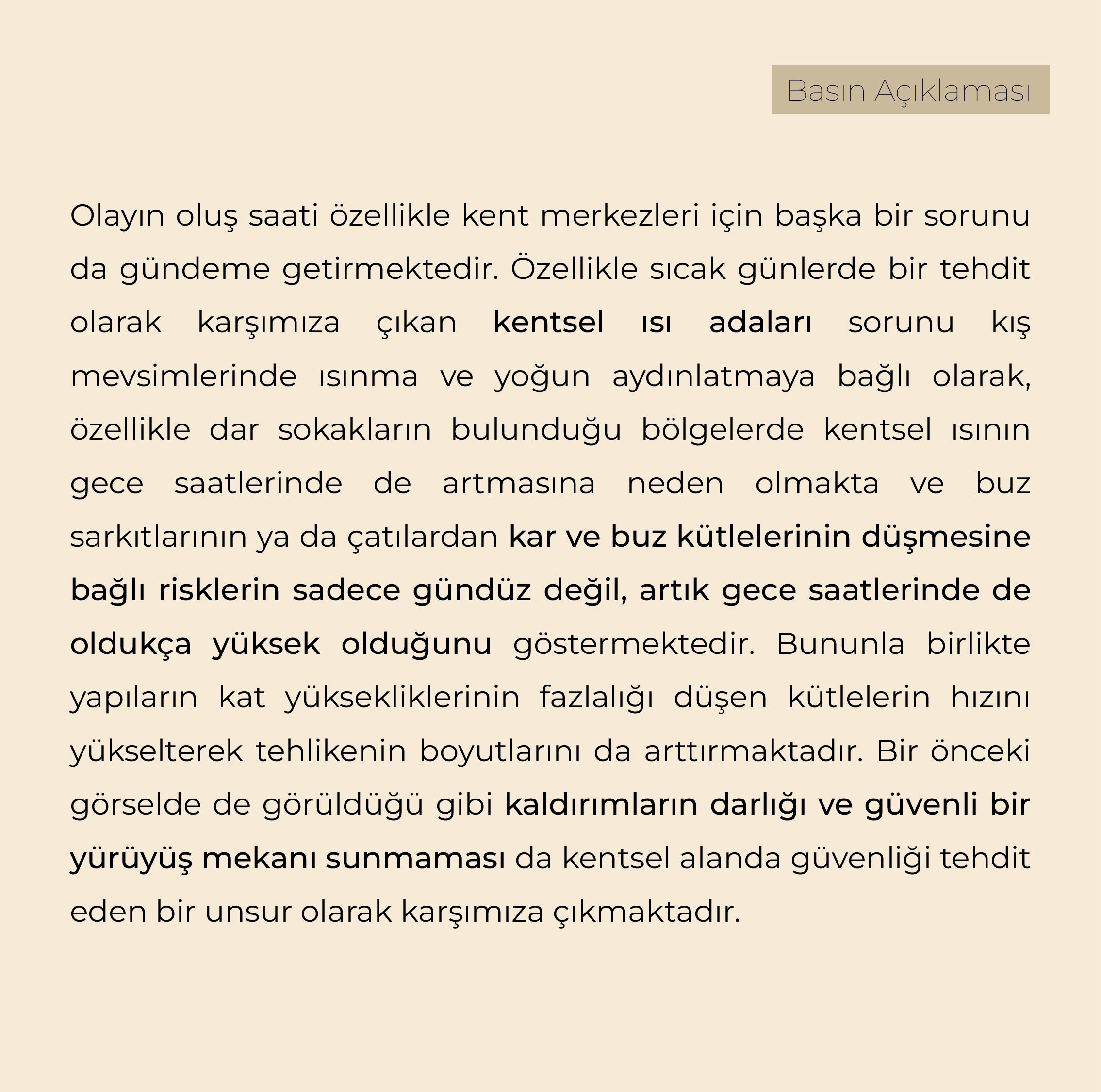 Olayın oluş saati özellikle kent merkezleri için başka bir sorunu da gündeme getirmektedir. Özellikle sıcak günlerde bir tehdit olarak karşımıza çıkan kentsel ısı adaları sorunu kış mevsimlerinde ısınma ve yoğun aydınlatmaya bağlı olarak, özellikle dar sokakların bulunduğu bölgelerde kentsel ısının gece saatlerinde de artmasına neden olmakta ve buz sarkıtlarının ya da çatılardan kar ve buz kütlelerinin düşmesine bağlı risklerin sadece gündüz değil, artık gece saatlerinde de oldukça yüksek olduğunu göstermektedir. Bununla birlikte yapıların kat yüksekliklerinin fazlalığı düşen kütlelerin hızını yükselterek tehlikenin boyutlarını da arttırmaktadır. Şekil2`de de görüldüğü gibi kaldırımların darlığı ve güvenli bir yürüyüş mekanı sunmaması da kentsel alanda güvenliği tehdit eden bir unsur olarak karşımıza çıkmaktadır.