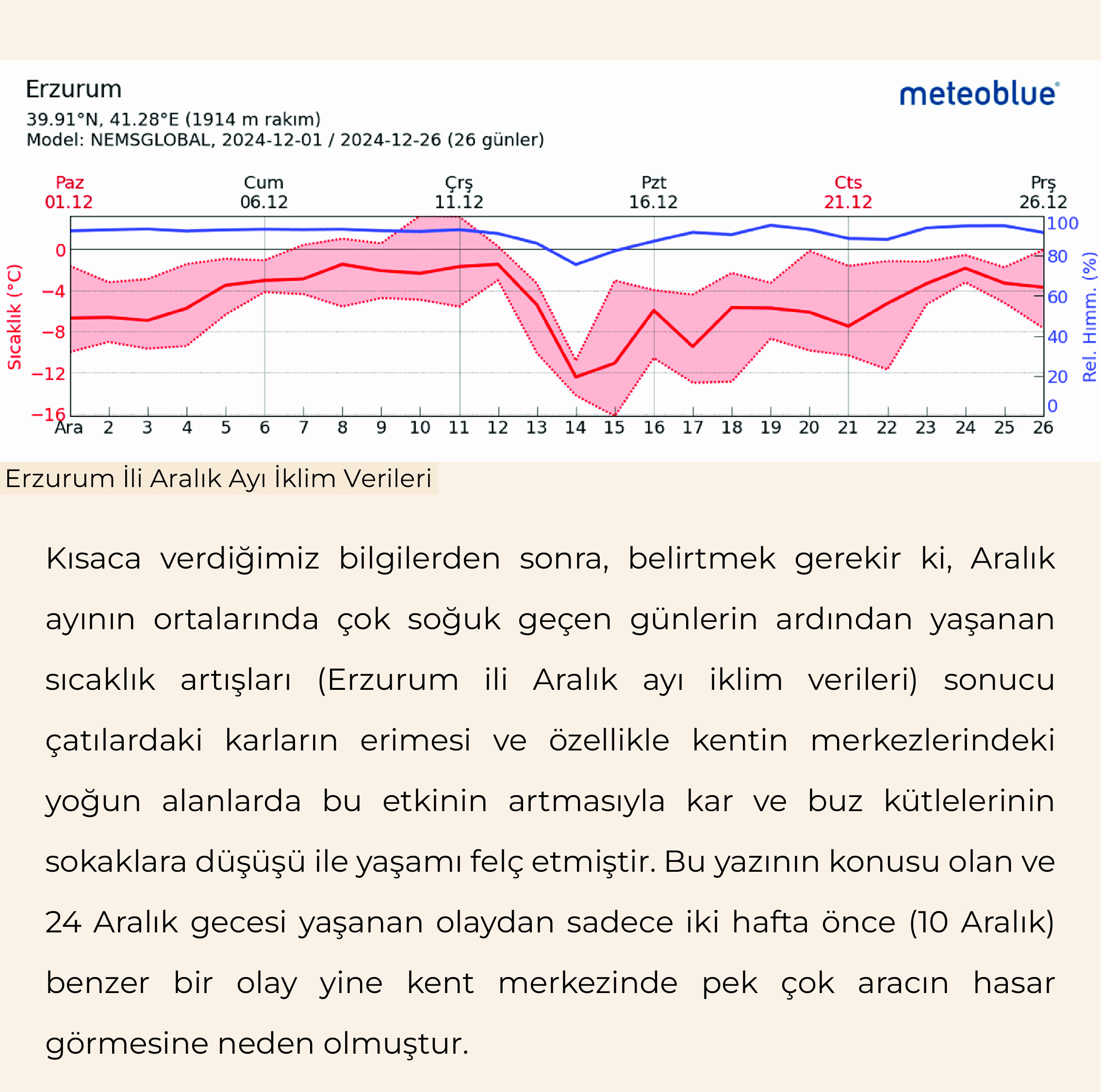 Kısaca verdiğimiz bilgilerden sonra, belirtmek gerekir ki, Aralık ayının ortalarında çok soğuk geçen günlerin ardından yaşanan sıcaklık artışları (Şekil 2) sonucu çatılardaki karların erimesi ve özellikle kentin merkezlerindeki yoğun alanlarda bu etkinin artmasıyla kar ve buz kütlelerinin sokaklara düşüşü ile yaşamı felç etmiştir. Bu yazının konusu olan ve 24 Aralık gecesi yaşanan olaydan sadece iki hafta önce (10 Aralık) benzer bir olay yine kent merkezinde pek çok aracın hasar görmesine neden olmuştur (bakınız Resim 2).