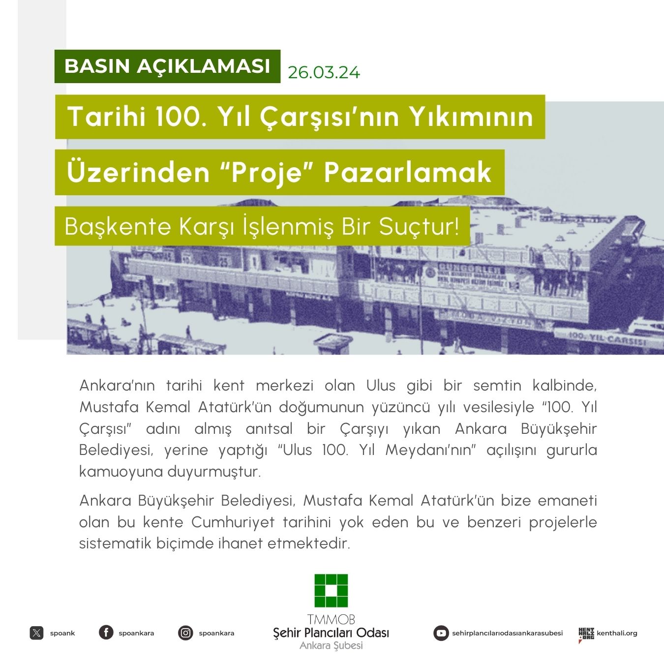 İlgili meslek odaları olarak hukuki ve toplumsal mücadele ile Ulus 100. Yıl Çarşısı`nı korumak için elimizden geleni yaptığımızı ve Ulus`un kente kazandırdığı tüm değerleri savunmaya devam edeceğimizi bir kez daha kamuoyuna bildirmek istiyoruz. Bugün Çarşının bulunduğu alanda betondan bir meydanın ve bir otoparkın Ankara halkına bir belediyecilik hizmeti olarak sunulmasından, her şeyden önce kent mekanımıza sahip çıkan yurttaşlar olarak utanç duyuyoruz.