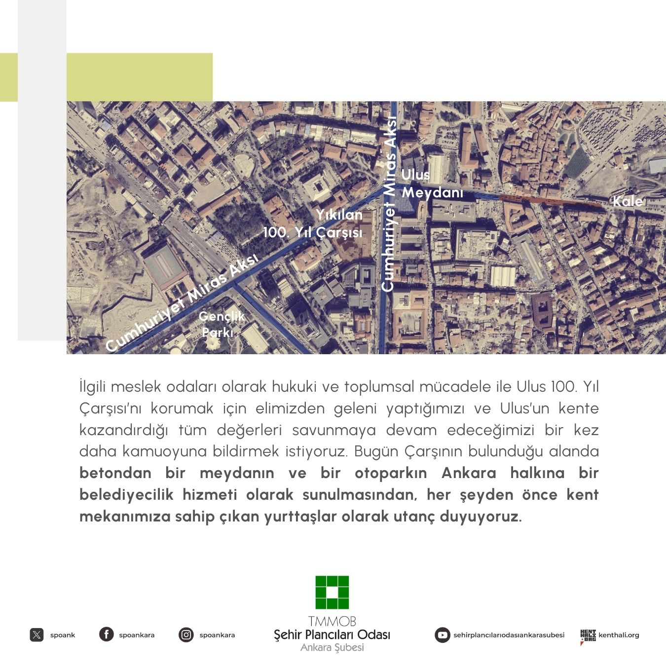 - Ulus`un en temel ihtiyacı, kapalı otoparklardan, düzlenmiş yavan meydanlardan önce, yıllardır savunduğumuz gibi bütüncül bir koruma amaçlı imar planıdır. Ancak "halkın proje beklediği" savunusuyla başkente karşı suç işlenmeye devam edilmektedir. Başkentliler bu parçacıl ve yıkıcı projelerden çok daha fazlasını hak etmektedir.