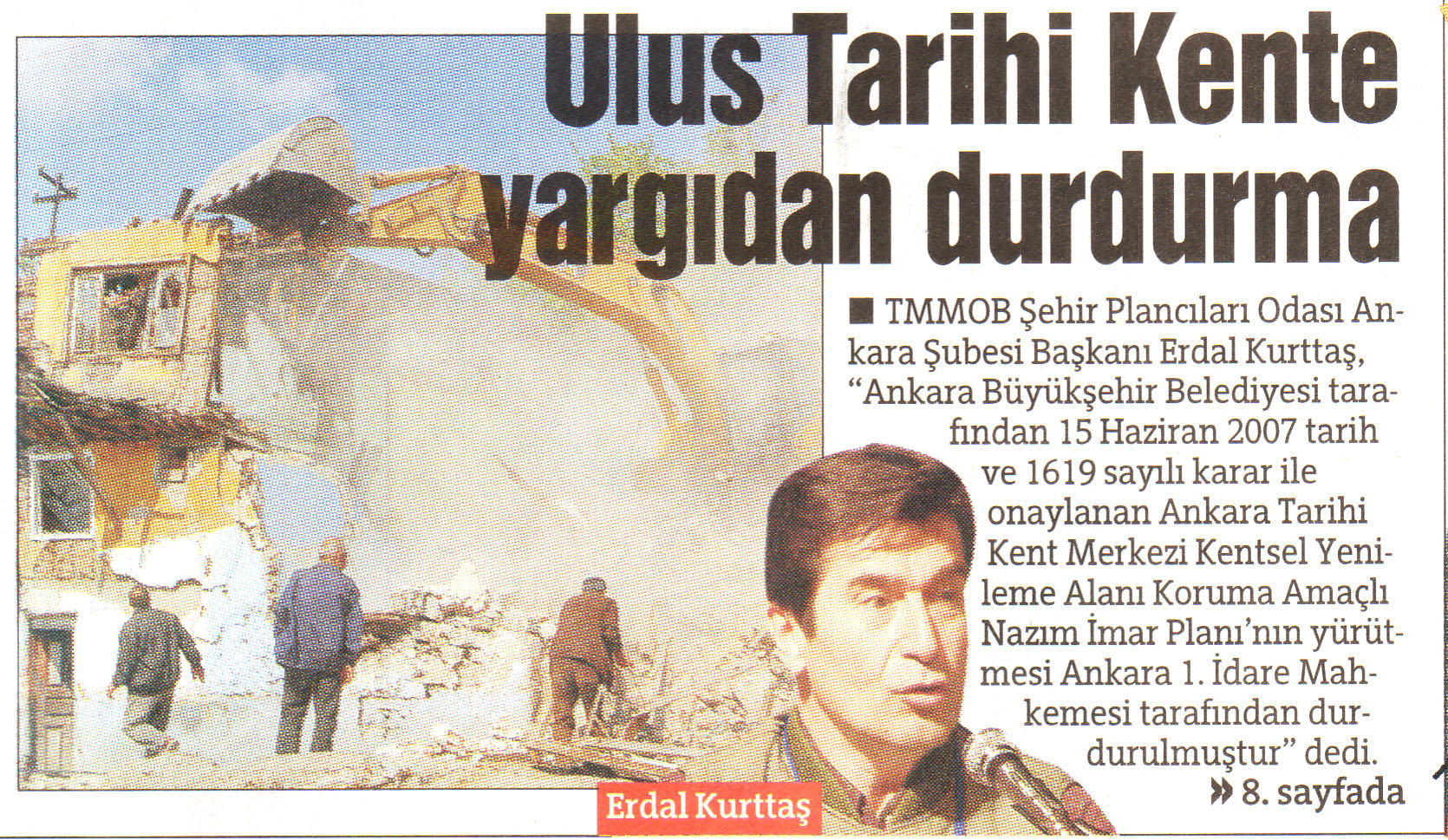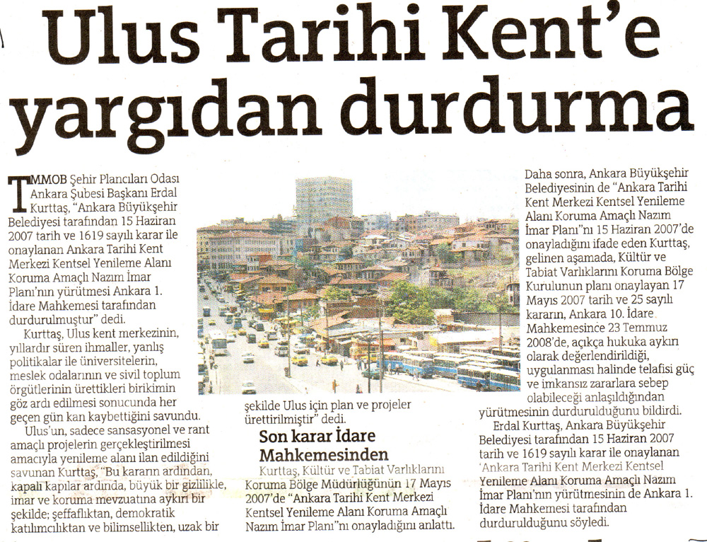 · Ankara Büyükşehir Belediyesi tarafından 15.06.2007 tarih ve 1619 s. karar ile onaylanan "Ankara Tarihi Kent Merkezi Kentsel Yenileme Alanı Koruma Amaçlı Nazım İmar Planı"nın yürütmesi Ankara 1. İdare Mahkemesi tarafından durdurulmuştur.