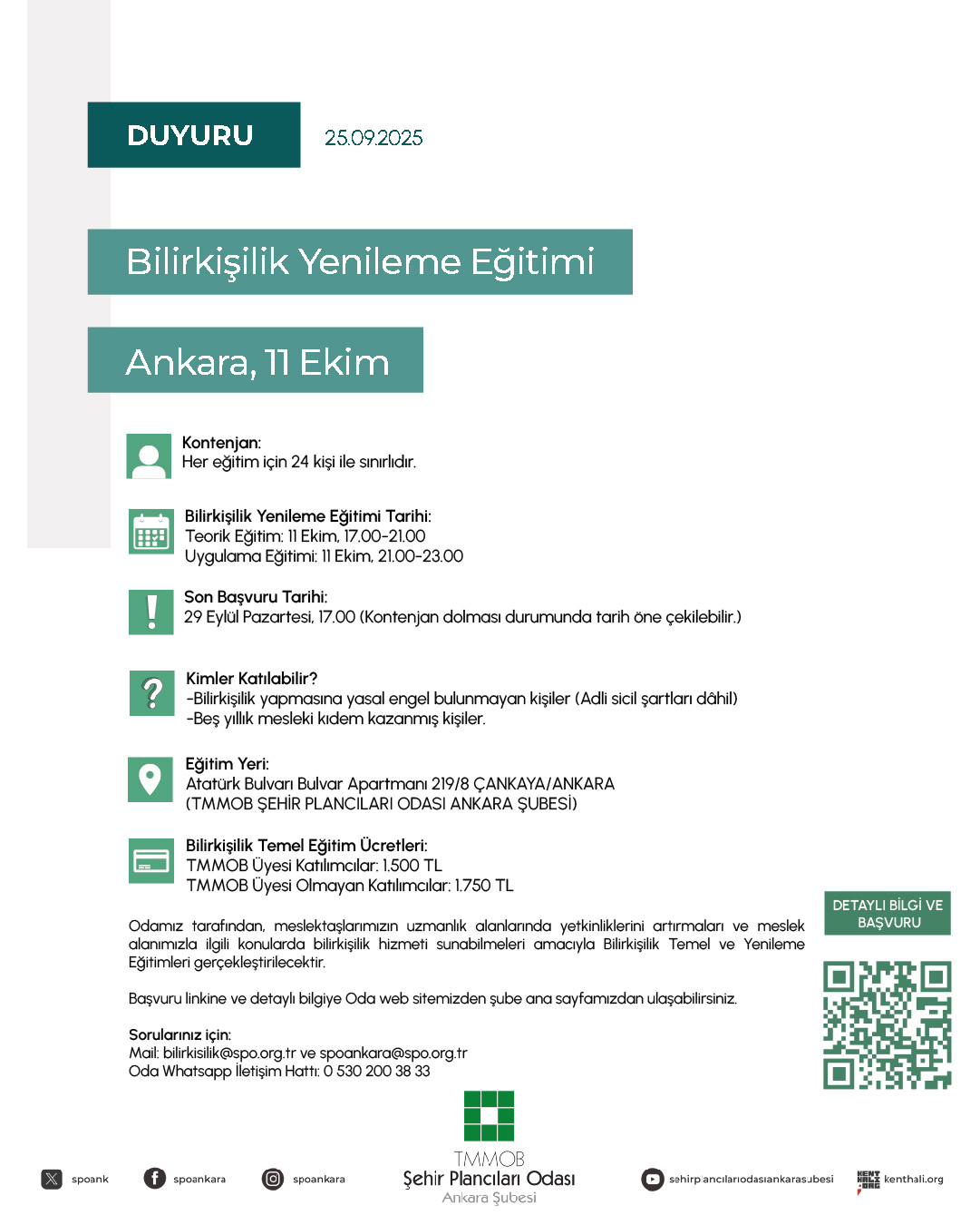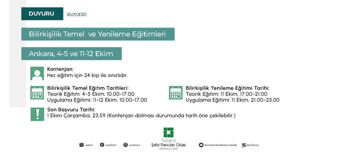 11 Ekim 2025 tarihinde Ankara‘da gerçekleştirilecek "Bilirkişilik Yenileme Eğitimi" için kayıtlar devam etmektedir. Eğitim toplam 6 saat olup; bunun 4 saati teorik eğitim, 2 saati ise uygulama eğitimidir. Eğitim sonunda; eğitimi başarı ile tamamlayan katılımcılara Adalet Bakanlığı Bilirkişilik Daire Başkanlığı Yetkili Eğitim Kurumu olarak TMMOB Şehir Plancıları Odası onaylı "Bilirkişilik Yenileme Eğitim Sertifikası" verilecektir.