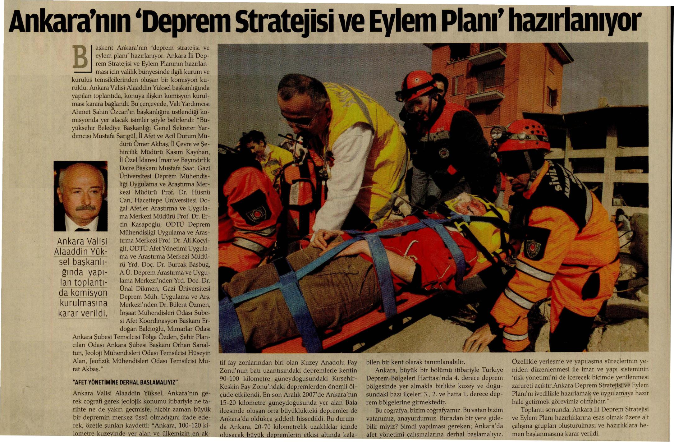 Başkent Ankara‘nın ‘deprem stratejisi ve eylem planı‘ hazırlanıyor. Ankara İli Deprem Stratejisi ve Eylem Planının hazırlanması için valilik bünyesinde ilgili kurum ve kuruluş temsilcilerinden oluşan bir komisyon kuruldu. Ankara Valisi Alaaddin Yüksel başkanlığında yapılan toplantıda, konuya ilişkin komisyon kurulması karara bağlandı. Bu çerçevede, Vali Yardımcısı Ahmet Şahin Özcan‘ın başkanlığını üstlendiği komisyonda yer alacak isimler şöyle belirlendi: "Büyükşehir Belediye Başkanlığı Genel Sekreter Yardımcısı Mustafa Sarıgül, İl Afet ve Acil Durum Müdürü Ömer Akbaş, İl Çevre ve Şehircilik Müdürü Kasım Kayıhan, İl Özel İdaresi İmar ve Bayındırlık Daire Başkanı Mustafa Saat, Gazi Üniversitesi Deprem Mühendisliği Uygulama ve Araştırma Merkezi Müdürü Prof. Dr. Hüsnü Can, Hacettepe Üniversitesi Doğal Afetler Araştırma ve Uygulama Merkezi Müdürü Prof. Dr. Ercin Kasapoglu, ODTÜ Deprem Mühendisliği Uygulama ve Araştırma Merkezi Prof. Dr. Ali Koçyigit, ODTÜ Afet Yönetimi Uygulama ve Araştırma Merkezi Müdürü Yrd. Doç. Dr. Burçak Başbuğ, A.Ü. Deprem Araştırma ve Uygulama Merkezi‘nden Yrd. Doç. Dr. Ünal Dikmen, Gazi Üniversitesi Deprem Müh. Uygulama ve Arş. Merkezi‘nden Dr. Bülent Özmen, İnşaat Mühendisleri Odası Şubesi Afet Koordinasyon Başkanı Erdoğan Balcıoglu, Mimarlar Odası Ankara Şubesi Temsilcisi Tolga Özden, Şehir Plancıları Odası Ankara Şubesi Başkanı Orhan Sarıaltun, Jeoloji Mühendisleri Odası Temsilcisi Hüseyin Alan, Jeofizik Mühendisleri Odası Temsilcisi Murat Akbaş."