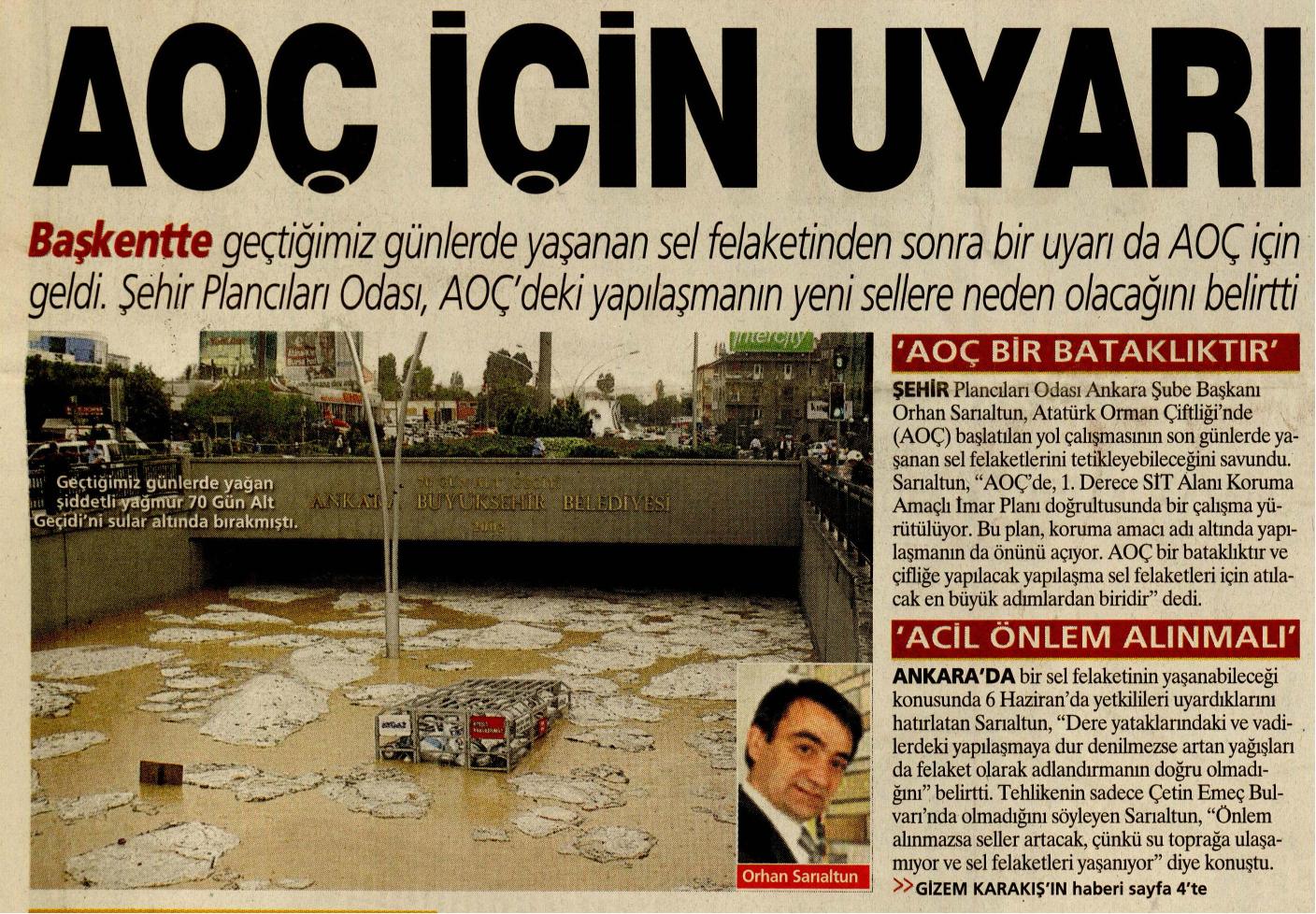 Şehir Plancıları Odası Ankara Şubesi Başkanı Orhan Sarıaltun, Atatürk Orman Çifliği‘de (AOÇ) başlatılan yol çalışmasının son günlerde yaşanan sel felaketlerini tetikleyebileceğini savundu. Bu yapılaşmanın durdurulması için yasal yollara başvurduklarını da dile getiren Sarıaltun, "Büyükşehir Belediyesi çok büyük bir yanlışın içerisindedir. Sanıyorum Anayasa Mahkemesi‘nin kararını yanlış uyguluyorlar ya da bunu bahane ederek bazı yolları açmaya çalışıyorlar. AOÇ bir bataklıktır ve çifliğe yapılacak yapılaşma sel felaketleri için atılacak en büyük adımlardan biridir" dedi.