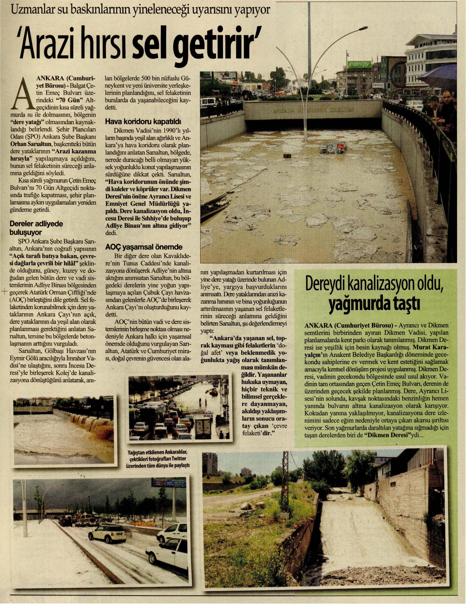 ŞPO Ankara Şube Başkam Sarıaltun, Ankara‘nın coğrafi yapısının "Açık taran batıya bakan, çevresi dağlarla çevrili bir hilâl" şeklinde olduğunu, güney, kuzey ve doğudan gelen bütün dere ve vadi sistemlerinin Adliye Binası bölgesinden geçerek Atatürk Orman Çiftliği‘nde (AOÇ) birleştiğini dile getirdi. Sel felaketinden korunabilmek için dere yataklarının Ankara Çayı‘nın açık, dere yataklarının da yeşil alan olarak planlanması gerektiğini anlatan Sarıaltun, tersine bu bölgelerde betonlaşmanın arttığım vurguladı.
