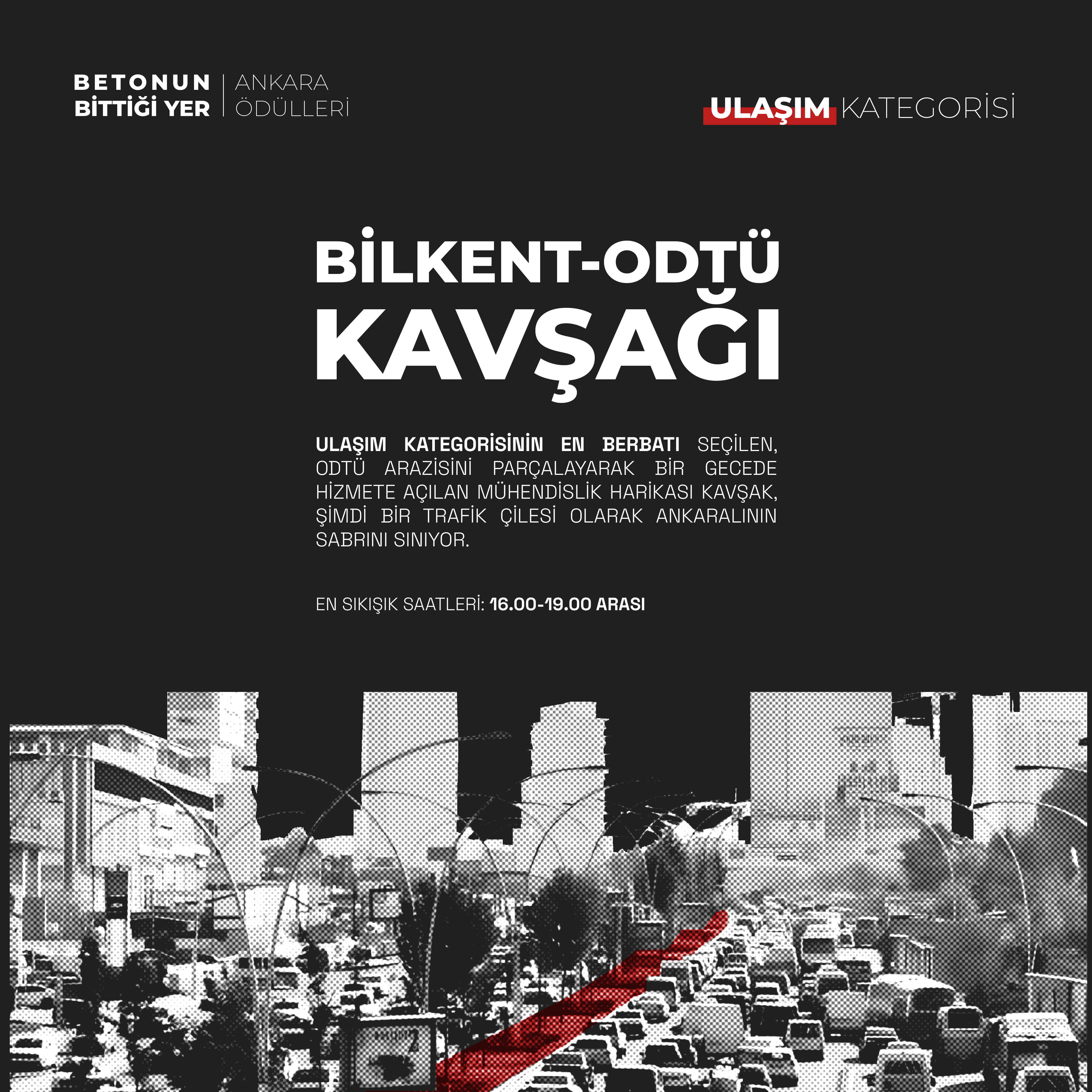 - Ulaşım kategorisi adayları, Ankara`da Ulaşım Ana Planı yapılmaksızın özel araç kullanımını özendiren; parçacıl plan kararları, projeler ve ihale yoluyla üretilen yol projeleri, kavşak düzenlemeleri ve bağlantı yollarına dair örnekleri içermektedir.
