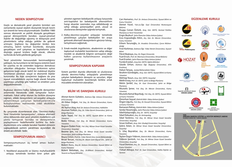 Sistem partileri dışında ülkemizde ve uluslararası alanda devrimci-halkçı anlayışlarla yönetilmeye çalışılan belediyelerin deneyim ve sorunları, diğer toplumsal muhalefet kesimleriyle birlikte ortak mücadele etmelerinin olanakları.
