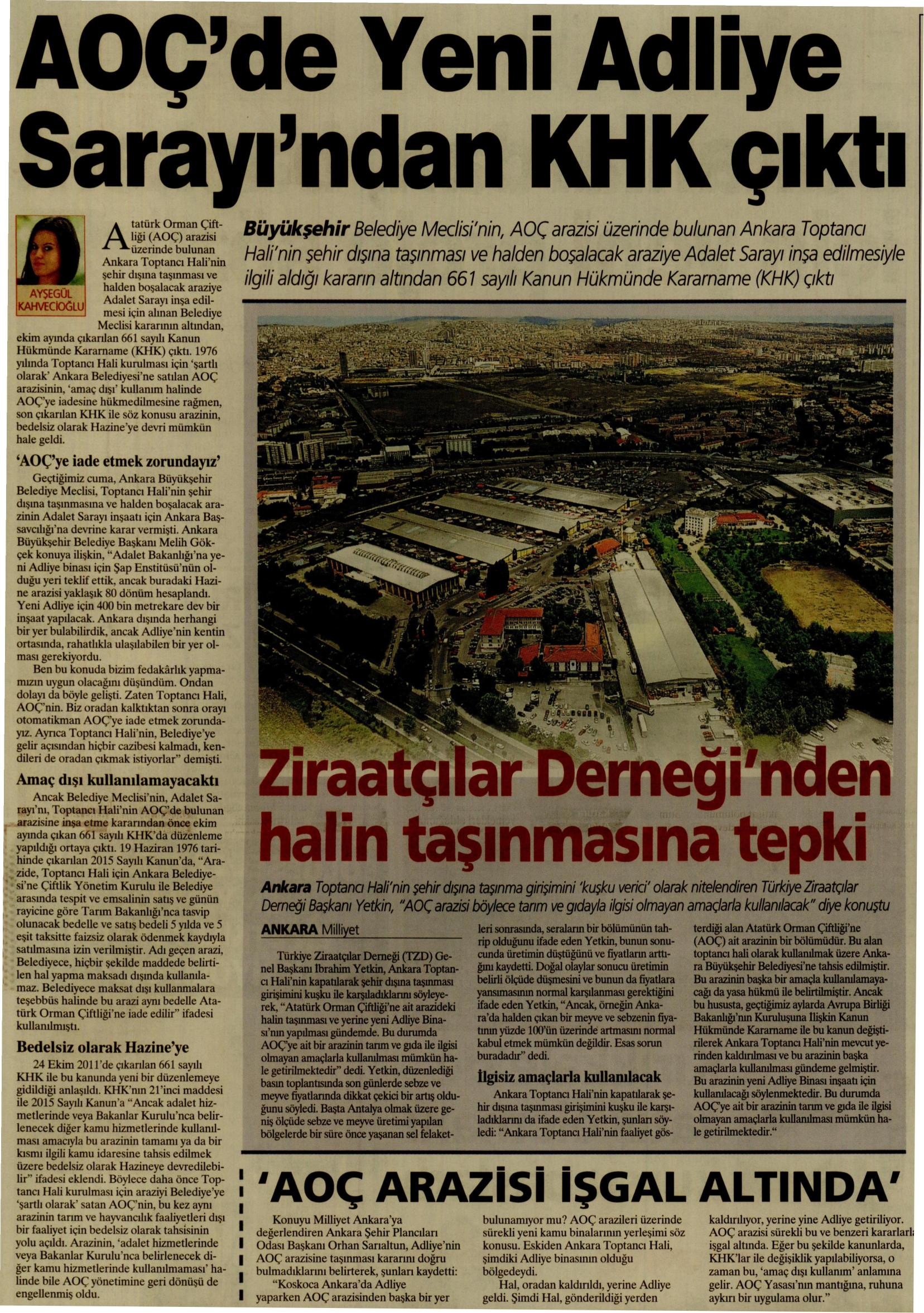 Atatürk Orman Çiftliği (AOÇ) arazisi üzerinde bulunan Ankara Toptancı Hali‘nin şehir dışına taşınması ve halden boşalacak araziye Adalet Sarayı inşa edilmesi için alınan Belediye Meclisi kararının altından, ekim ayında çıkarılan 661 sayılı Kanun Hükmünde Kararname (KHK) çıktı. 1976 yılında Toptancı Hali kurulması için ‘şartlı olarak‘ Ankara Belediyesi‘ne satılan AOÇ arazisinin, ‘amaç dışı‘ kullanım halinde AOÇ‘ye iadesine hükmedilmesine rağmen, son çıkarılan KHK ile söz konusu arazinin, bedelsiz olarak Hazine‘ye devri mümkün hale geldi.