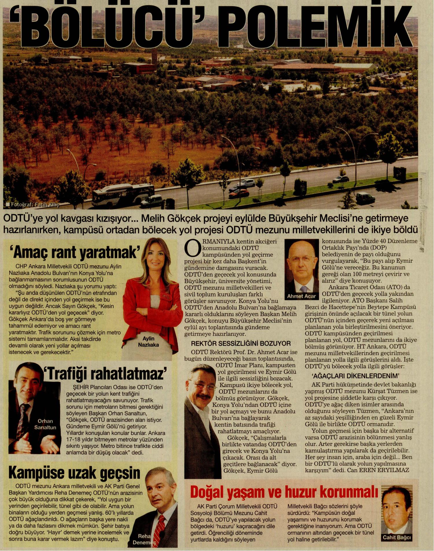 ODTÜ‘ye yol kavgası kızışıyor... Melih Gökçek projeyi eylülde Büyükşehir Meclisi‘ne getirmeye hazırlanırken, kampüsü ortadan bölecek yol projesi ODTÜ mezunu milletvekillerini de ikiye böldü
