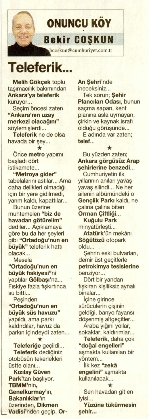 Teleferiğe geçildi... Teleferik dediğiniz otobüsün tekerlekleri üstte olanı... Kızılay Güven Park‘tan başlıyor. TBMM‘nin, Genelkurmay‘ın, Bakanlıklar‘ın üzerinden, Dikmen Vadisi‘nden geçip, OrAn Şehri‘nde ineceksiniz...