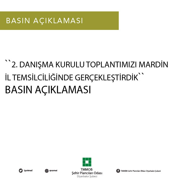 TMMOB Şehir Plancıları Odası Diyarbakır Şubesi II. Dönem 2. Danışma Kurulu Toplantısı Mardin İl`inde Mardin Temsilciliği, Şube Eş başkanları ve Şube Yönetim Kurulu Üyelerimizin katılımı ile gerçekleştirilmiştir.