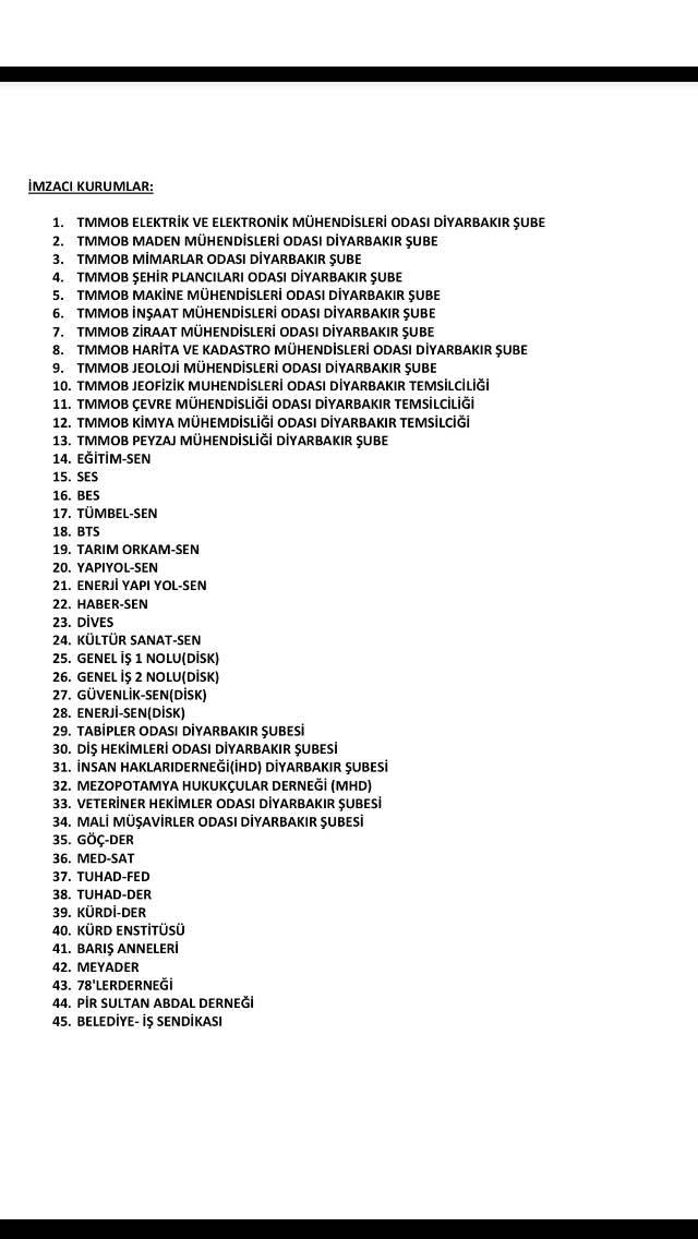 Bizler sivil toplum örgütleri olarak; halkın siyasi tercihine ve iradesine yönelik politik bir müdahale olarak değerlendirdiğimiz ve demokratik muhalefeti susturmaya yönelik hedefin bir parçası olarak gördüğümüz bu uygulamaya derhal son verilmesini, Diyarbakır Büyükşehir Belediyesi Eş Başkanları Sayın Gültan Kışanak ile Sayın Fırat Anlı`nın, Batman Eski Milletvekili Sayın Ayla Akat Ata`nın, HDP ve DBP İl ve İlçe Yöneticilerinin ve protesto gösterileri sırasında alınarak hala gözaltına tutulan yurttaşların derhal serbest bırakılmalarının talep ediliyoruz.