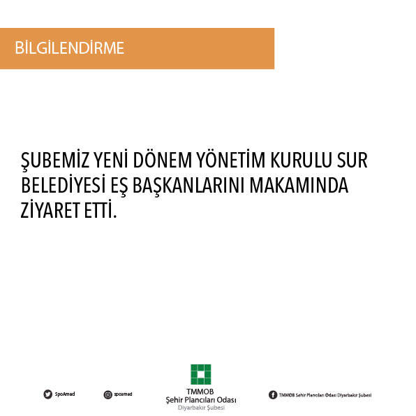 20.04.2016 tarihinde TMMOB Şehir Plancıları Odası Diyarbakır Şubesi Şube Başkanı Büşra Cizrelioğulları, Şube Eş Başkanı Fatih TEKİN, Şube Sekreteri Sinan NARINÇ, Şube Saymanı Çetin Aydın, Yönetim Kurulu üyemiz Elif KARA Sur Eş Başkanlarını makamında ziyaret etti.