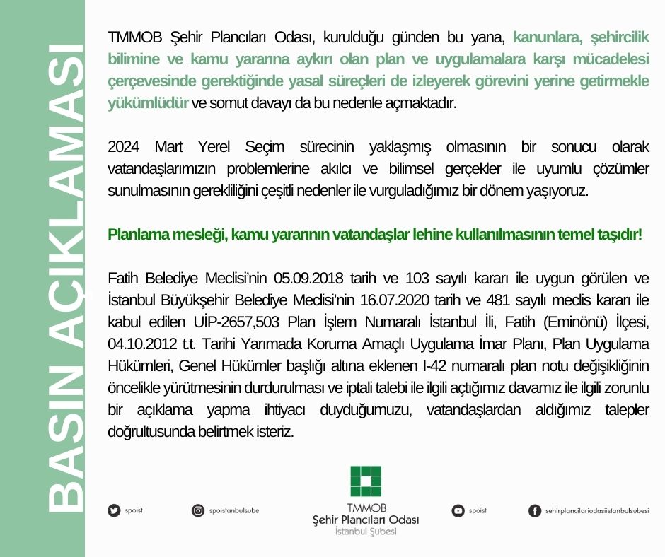 Fatih Belediye Meclisi`nin 05.09.2018 tarih ve 103 sayılı kararı ile uygun görülen ve İstanbul Büyükşehir Belediye Meclisi`nin 16.07.2020 tarih ve 481 sayılı meclis kararı ile kabul edilen UİP-2657,503 Plan İşlem Numaralı İstanbul İli, Fatih (Eminönü) İlçesi, 04.10.2012 t.t. Tarihi Yarımada Koruma Amaçlı Uygulama İmar Planı, Plan Uygulama Hükümleri, Genel Hükümler başlığı altına eklenen I-42 numaralı plan notu değişikliğinin öncelikle yürütmesinin durdurulması ve iptali talebi ile ilgili açtığımız davamız ile ilgili zorunlu bir açıklama yapma ihtiyacı duyduğumuzu, vatandaşlardan aldığımız talepler doğrultusunda belirtmek isteriz.