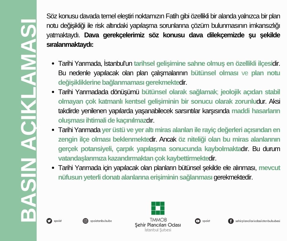 Son olarak İstanbullulardan aldığımız telefon aramalarına ve sosyal medya erişimlerine istinaden söz konusu dava surecimizin 2020/1913 esas ve 2022/682 karar no ile reddedildiğini, yani TMMOB Şehir Plancıları Odası`nın mevcut durumda yaşanan imar sorunları ile bir ilgisinin olmadığını kamuoyu ile paylaşmak isteriz.
