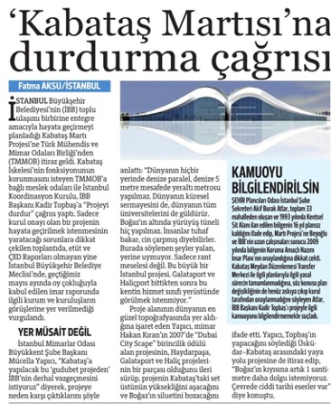 Mesleki, hukuki temel ve kentli hakları açısından eleştirilen "Kabataş Martı Projesi" adlı Transfer Merkezi inşaatının başlaması ile ilgili İBB tarafından yapılan açıklamada, 4 Ağustos‘ta Kabataş İskelelerinin kapatılacağı bildirilmesinin üzerine TMMOB İstanbul İl Koordinasyon Kurulu tarafından 3 Ağustos Çarşamba günü saat 11.00‘da, TMMOB Mimarlar Odası  İstanbul Büyükkent Şubesi`nde  basın toplantısı düzenlendi.