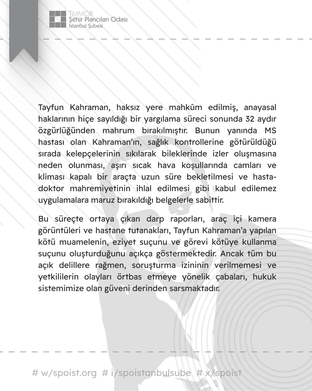 Şehir Plancıları Odası İstanbul Şubesi olarak, meslektaşımız ve yol arkadaşımız Tayfun Kahraman`ın cezaevinde ve hastane sürecinde maruz kaldığı insan hakları ihlallerine ilişkin derin üzüntü ve öfkemizi kamuoyuyla paylaşmak istiyoruz.