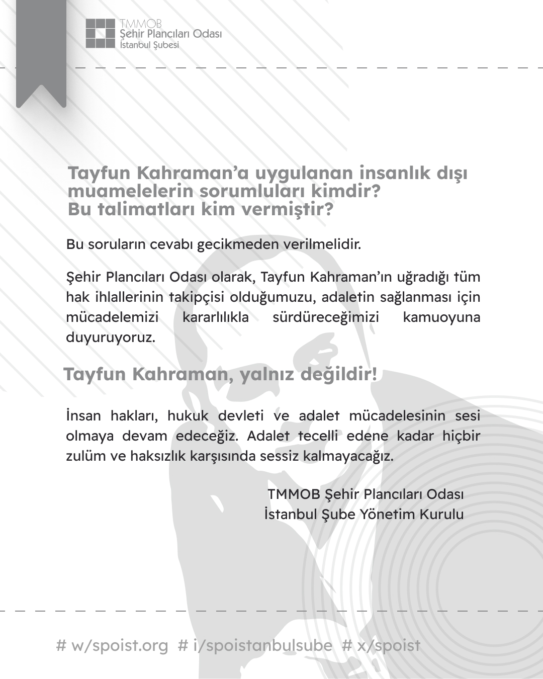 Şehir Plancıları Odası olarak, Tayfun Kahraman`ın uğradığı tüm hak ihlallerinin takipçisi olduğumuzu, adaletin sağlanması için mücadelemizi kararlılıkla sürdüreceğimizi kamuoyuna duyuruyoruz.