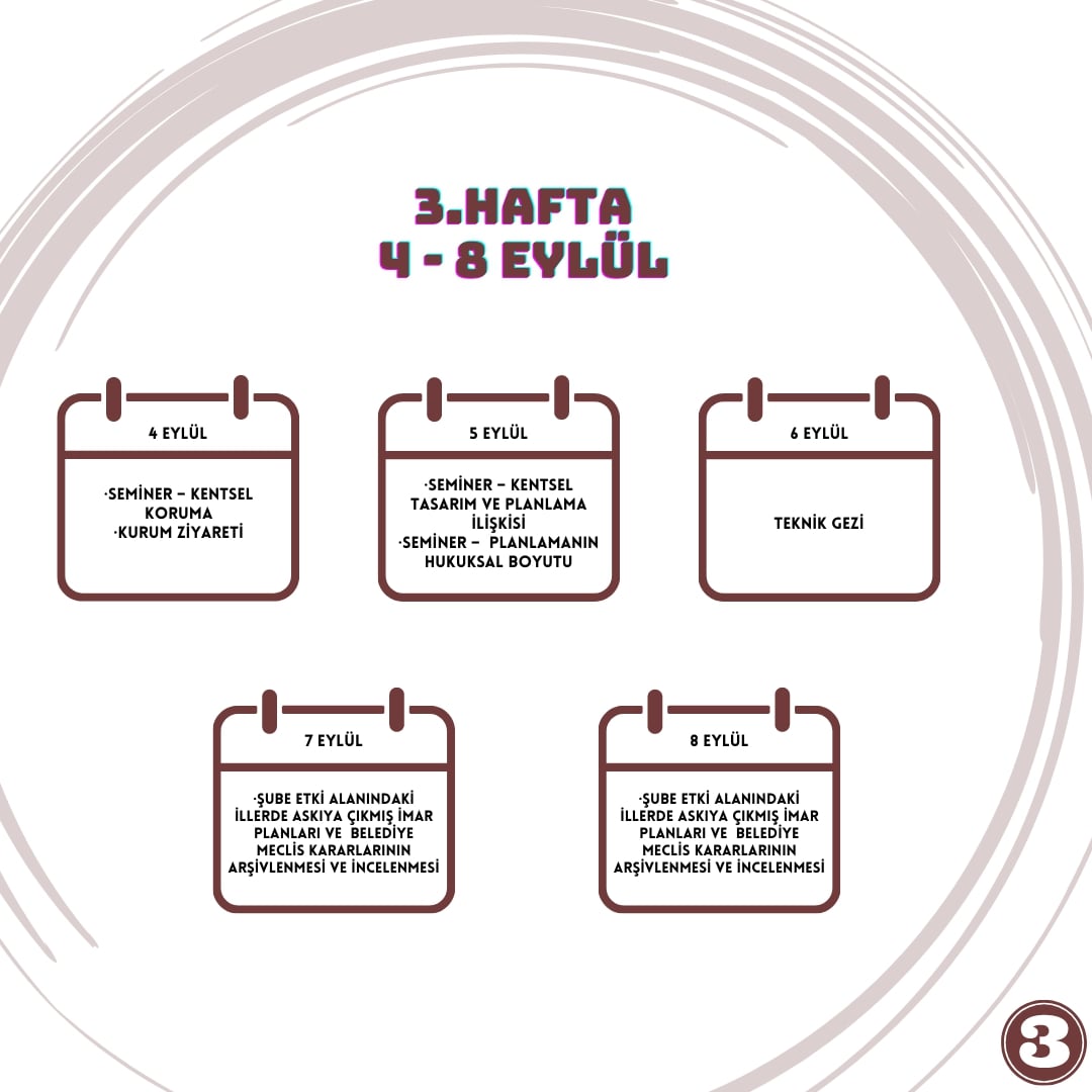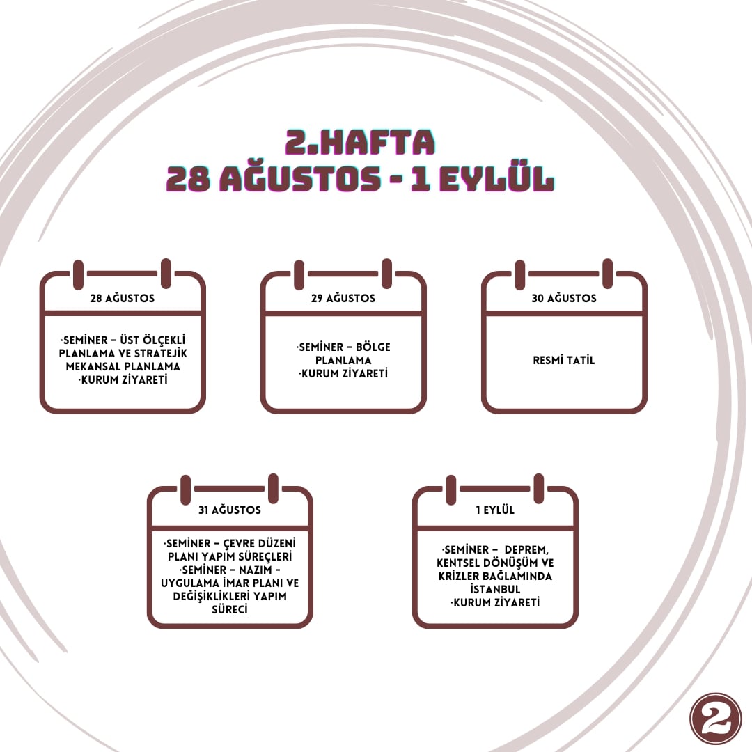Staj programı içerisinde seminerler, teknik gezi, kurum ziyaretleri ve Şube işleyişi ile ilgili aktiviteler belirlenmiş olup seminer verecek meslektaşlarımız ve kurum ziyaretlerine yönelik kesin program ilerleyen günlerde paylaşılacaktır. Belirlenmiş taslak programa aşağıdaki görsellerden ulaşabilirsiniz.