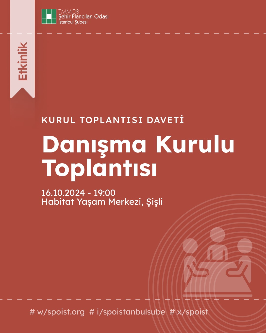 TMMOB Şehir Plancıları Odası İstanbul Şubesi olarak XVIII. Dönem III. Danışma Kurulumuzu 16 Ekim 2024 Çarşamba günü 19.00da Şişli Habitat Yaşam Merkezinde gerçekleştireceğiz. Aşağıda yer alan formu doldurarak kaydınızı 15 Ekim 2024 Salı günü 18.00e kadar oluşturabilirsiniz. Toplantımız tek gündemli olarak gerçekleşecek olup konusu Şube mekanın belirlenmesi üzerine son durumun değerlendirmesi olacaktır. Bilgilerinize sunarız.