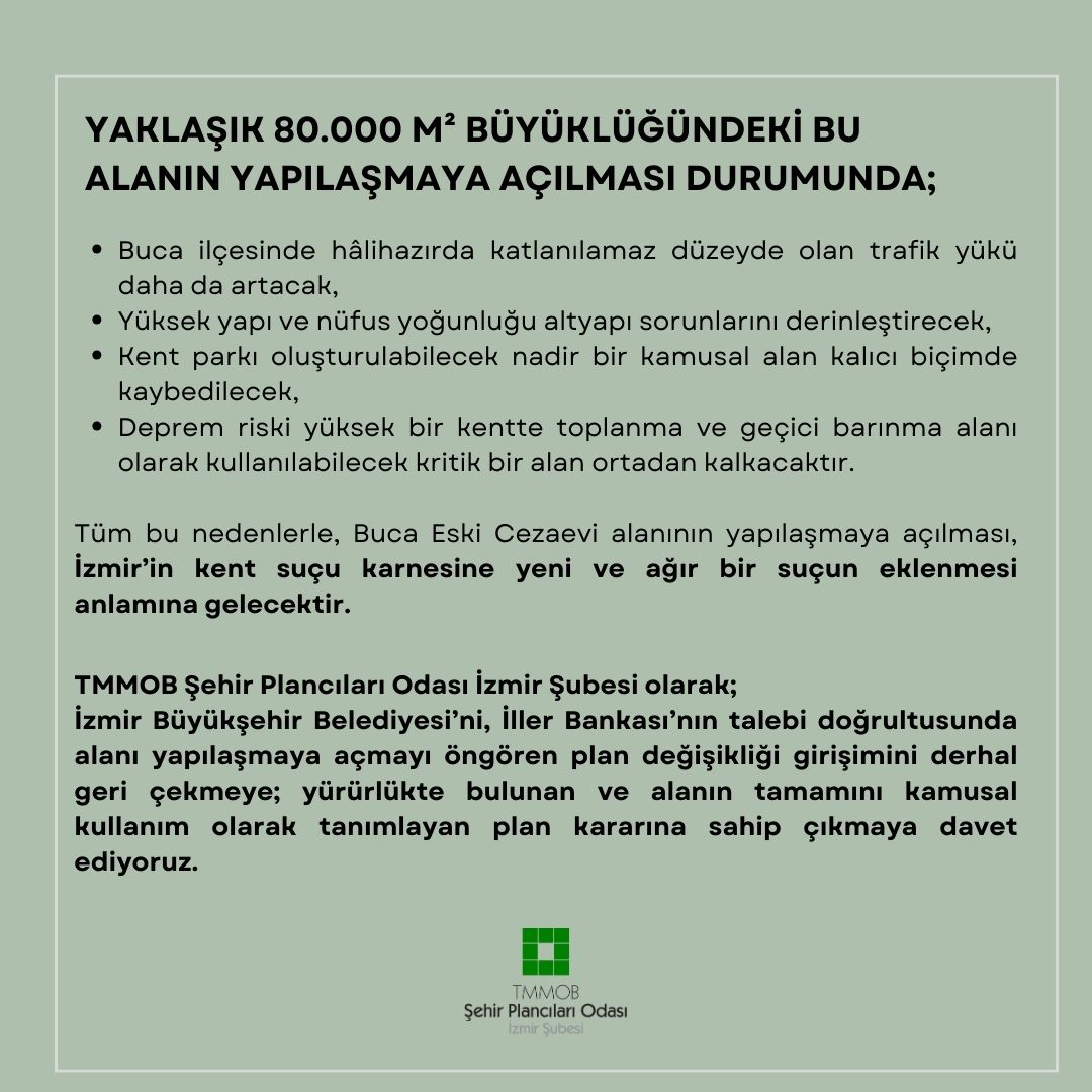 Buca Eski Cezaevi alanında yürürlükte bulunan planlarda yer alan kamusal kullanım kararlarını kaldırarak alanı yapılaşmaya açmaya yönelik her türlü girişime karşı, mesleki ve kamusal sorumluluğumuz gereği tüm hukuki haklarımızı kullanacağımızı kamuoyuna saygıyla duyururuz.