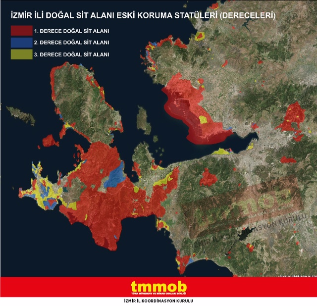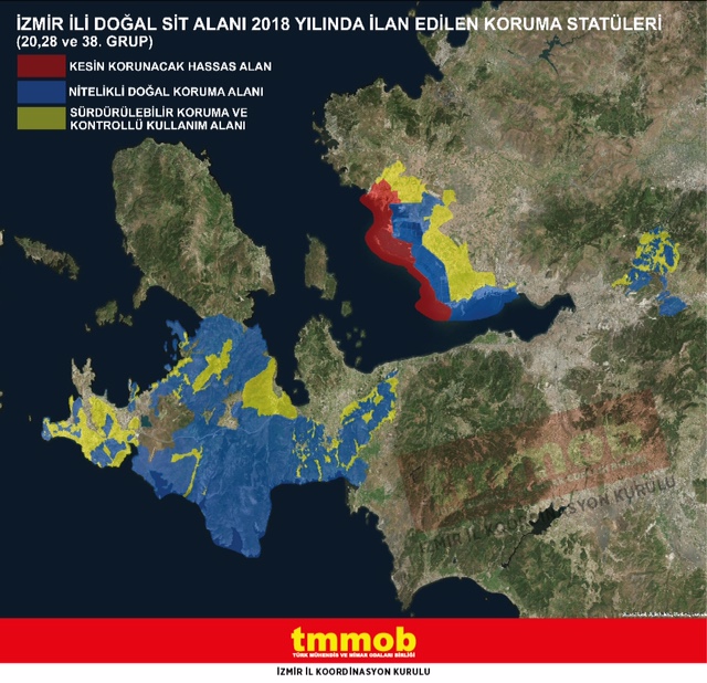 2012 yılında, Tabiat Varlıklarını Koruma yasal mevzuatında yapılan yeni düzenlemeler ile başlayan süreci TMMOB‘a bağlı ilgili meslek odaları, Sualtı Araştırmaları Derneği ve Doğa Derneği ile birlikte ülkemizin doğal yaşam alanlarının korunmasına gönül vermiş bireyler olarak yakından takip etmeye çalışıyoruz. Bu süreçte, Çevre ve Şehircilik Bakanlığı ilk olarak 2016 yılında 38. Grup (Çeşme, Seferihisar, Urla, Güzelbahçe İlçeleri) için başlamış olup devamında Çeşme Yarımadası, Gediz Deltası ve Bornova`yı içine alan 6 farklı grupta (13, 20, 27, 28, 35 ve 37. Grup) doğal sit statülerine yönelik yeni düzenlemeler Bakanlık Oluru ile ilan edilmiştir. TMMOB Şehir Plancıları Odası İzmir Şubesi ve TMMOB Peyzaj Mimarları Odası İzmir Şubesi olarak yapılan düzenlemelerin bütüncül bir yaklaşım ve bilimsel gerçeklerden uzak olması, rant ve kişisel menfaatler gözetilerek belirlendiği gerekçeleriyle dava açılmıştı. Ancak geldiğimiz son süreçte önceki ilan edilen ve yeni bölgelerle birlikte; Çevre ve Şehircilik Bakanlık Makamının oluru ile 27.04.2018 tarihli 76073 sayılı 28. Grup (Bornova İlçesi), 76074 sayılı 38. Grup (Çeşme, Seferihisar, Urla, Güzelbahçe İlçeleri) ve 76071 sayılı 20. Grup (Foça, Menemen, Çiğli İlçeleri) Doğal Sit Alanı, "Doğal Sit-Nitelikli Doğal Koruma Alanı" ve "Doğal Sit-Sürdürülebilir Koruma ve Kontrollü Kullanım Alanı" olarak tescil edilmesi sonucunu doğuran doğal sit değişikliği kararı onaylanmıştır. Bu karara 20.07.2018 tarihinde öncelikle yürütmesinin durdurulması, takiben iptaline karar verilmesi istemiyle TMMOB İKK olarak dava sürecini başlatmış bulunmaktayız.