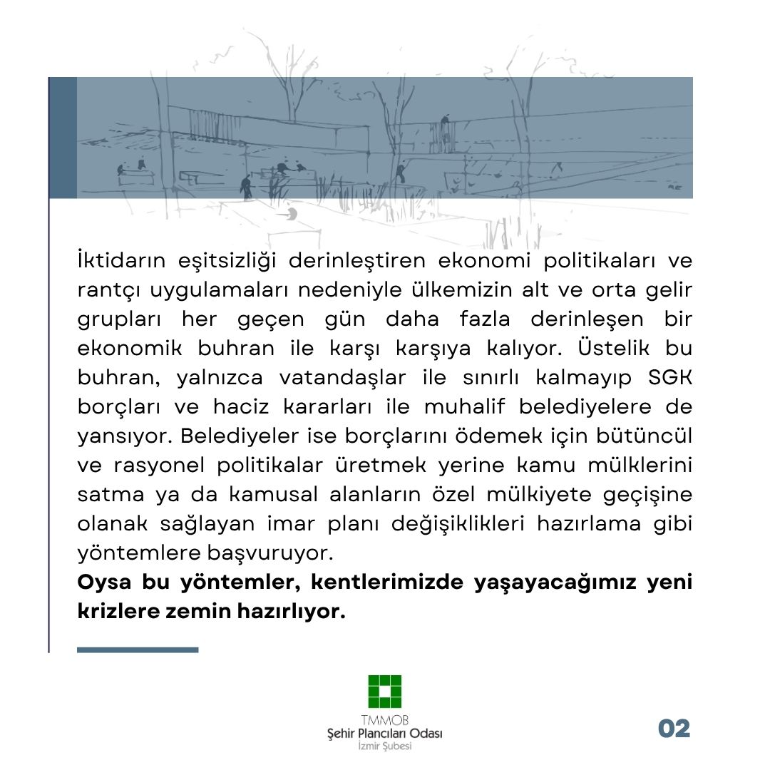 İktidarın eşitsizliği derinleştiren ekonomi politikaları ve rantçı uygulamaları nedeniyle ülkemizin alt ve orta gelir grupları her geçen gün daha fazla derinleşen bir ekonomik buhran ile karşı karşıya kalıyor. Üstelik bu buhran, yalnızca vatandaşlar ile sınırlı kalmayıp SGK borçları ve haciz kararları ile muhalif belediyelere de yansıyor. Belediyeler ise borçlarını ödemek için bütüncül ve rasyonel politikalar üretmek yerine kamu mülklerini satma ya da kamusal alanların özel mülkiyete geçişine olanak sağlayan imar planı değişiklikleri hazırlama gibi yöntemlere başvuruyor.