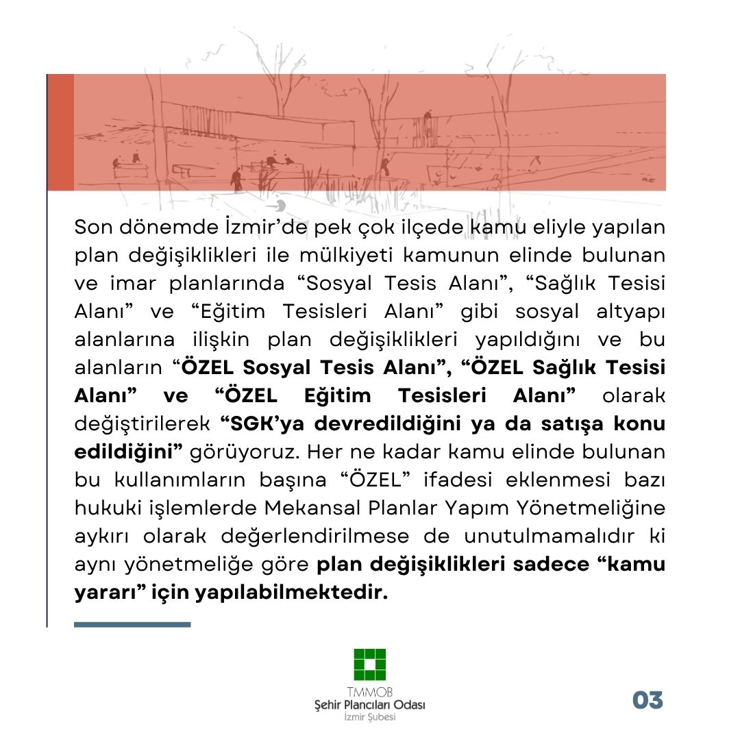 Son dönemde İzmir`de pek çok ilçede kamu eliyle yapılan plan değişiklikleri ile mülkiyeti kamunun elinde bulunan ve imar planlarında "Sosyal Tesis Alanı", "Sağlık Tesisi Alanı" ve "Eğitim Tesisleri Alanı" gibi sosyal altyapı alanlarına ilişkin plan değişiklikleri yapıldığını ve bu alanların "ÖZEL Sosyal Tesis Alanı", "ÖZEL Sağlık Tesisi Alanı" ve "ÖZEL Eğitim Tesisleri Alanı" olarak değiştirilerek "SGK`ya devredildiğini ya da satışa konu edildiğini" görüyoruz. Her ne kadar kamu elinde bulunan bu kullanımların başına "ÖZEL" ifadesi eklenmesi bazı hukuki işlemlerde Mekansal Planlar Yapım Yönetmeliğine aykırı olarak değerlendirilmese de unutulmamalıdır ki aynı yönetmeliğe göre plan değişiklikleri sadece "kamu yararı" için yapılabilmektedir.