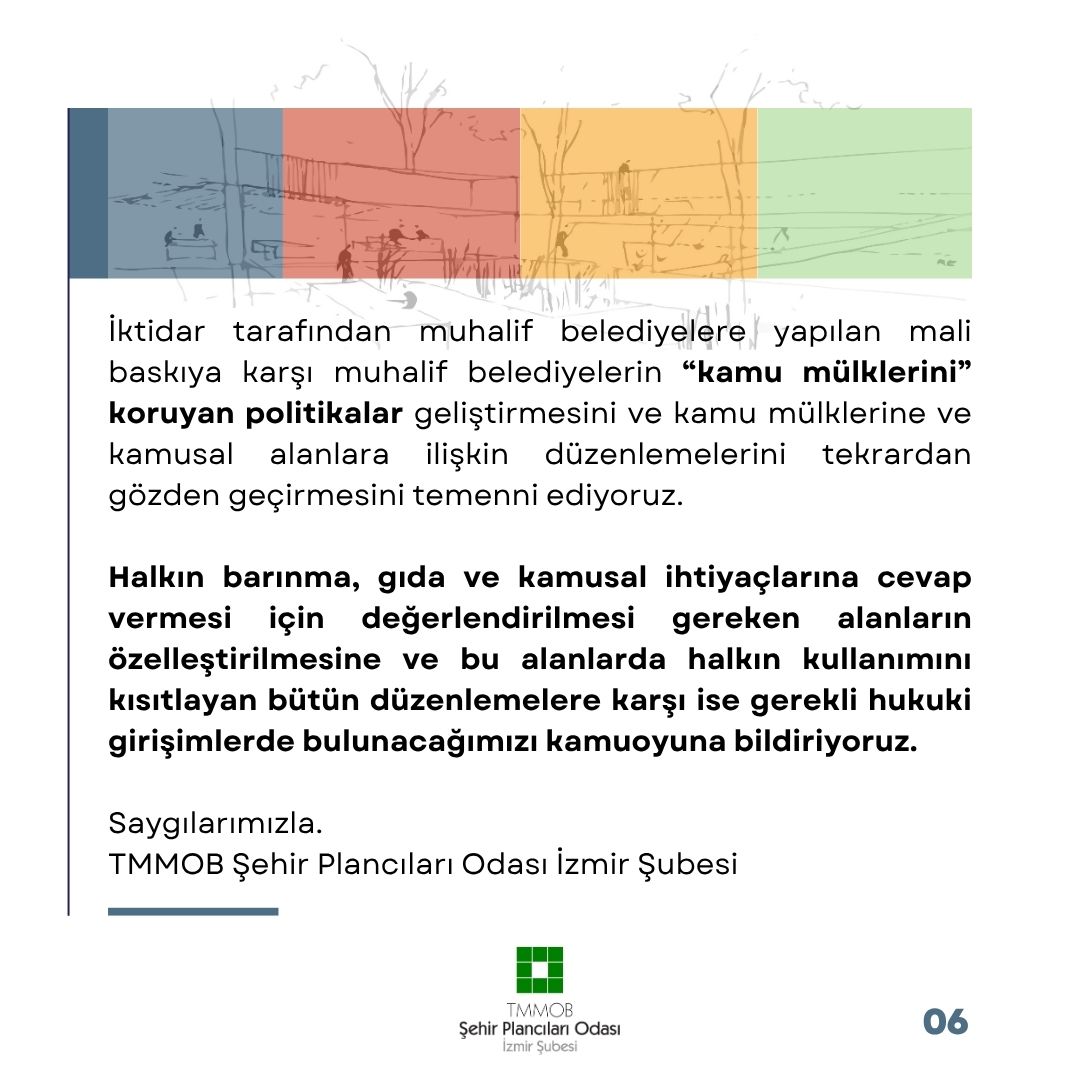 İktidar tarafından muhalif belediyelere yapılan mali baskıya karşı muhalif belediyelerin "kamu mülklerini" koruyan politikalar geliştirmesini ve kamu mülklerine ve kamusal alanlara ilişkin düzenlemelerini tekrardan gözden geçirmesini temenni ediyoruz.