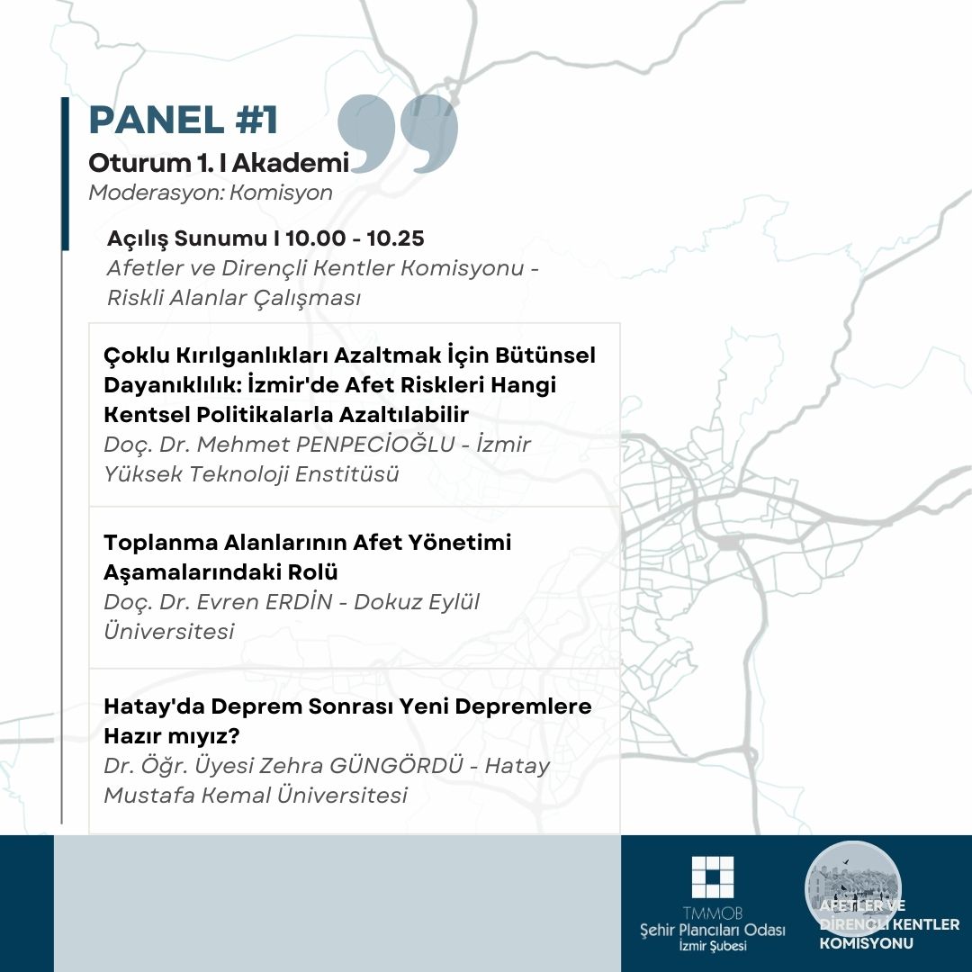 Panel, herkesin katılımına açık olup, 16 Kasım Cumartesi saat 10.00 - 16.00 saatleri arasında İzmir Mimarlık Merkezi Konferans Salonunda gerçekleştirilecektir. Oturum 1. Hibrid gerçekleşecek olup ekte yer alan zoom bağlantısı ile çevrimiçi katılım sağlayabilirsiniz.