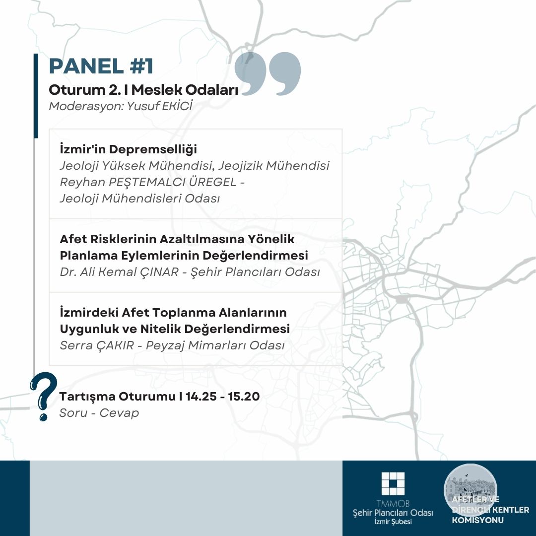 TMMOB Şehir Plancıları Odası İzmir Şubesi - Afetler ve Dirençli Kentler Komisyonu olarak, afetler ve dirençli kentler konularında farkındalığı artırmak amacıyla bir panel serisine başlıyoruz. Bu serinin ilk paneli, 16 Kasım 2024 tarihinde İzmir Mimarlık Merkezi`nde "Deprem Riski: Neden Hazır Değiliz?" başlığıyla gerçekleştirilecektir. Panelde, özellikle İzmir`in depreme hazırlık durumu üzerinde durulacak ve çeşitli uzmanlık alanlarından katılımcıların görüşlerine yer verilecektir.