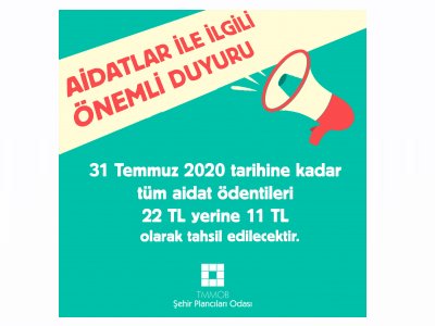 * 2020 yılı Nisan ayı sonrası (yıl sonuna kadar) aidat ödemeleri sistemde aktif hale yeni getirilmiştir. 2020 yılı tüm aidat borçlarınızı 31 Temmuz 2020 tarihine kadar 11 TL üzerinden ödeyebilirsiniz.